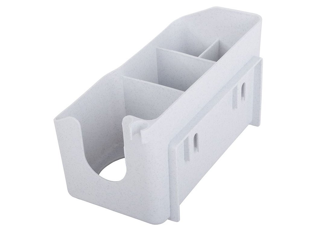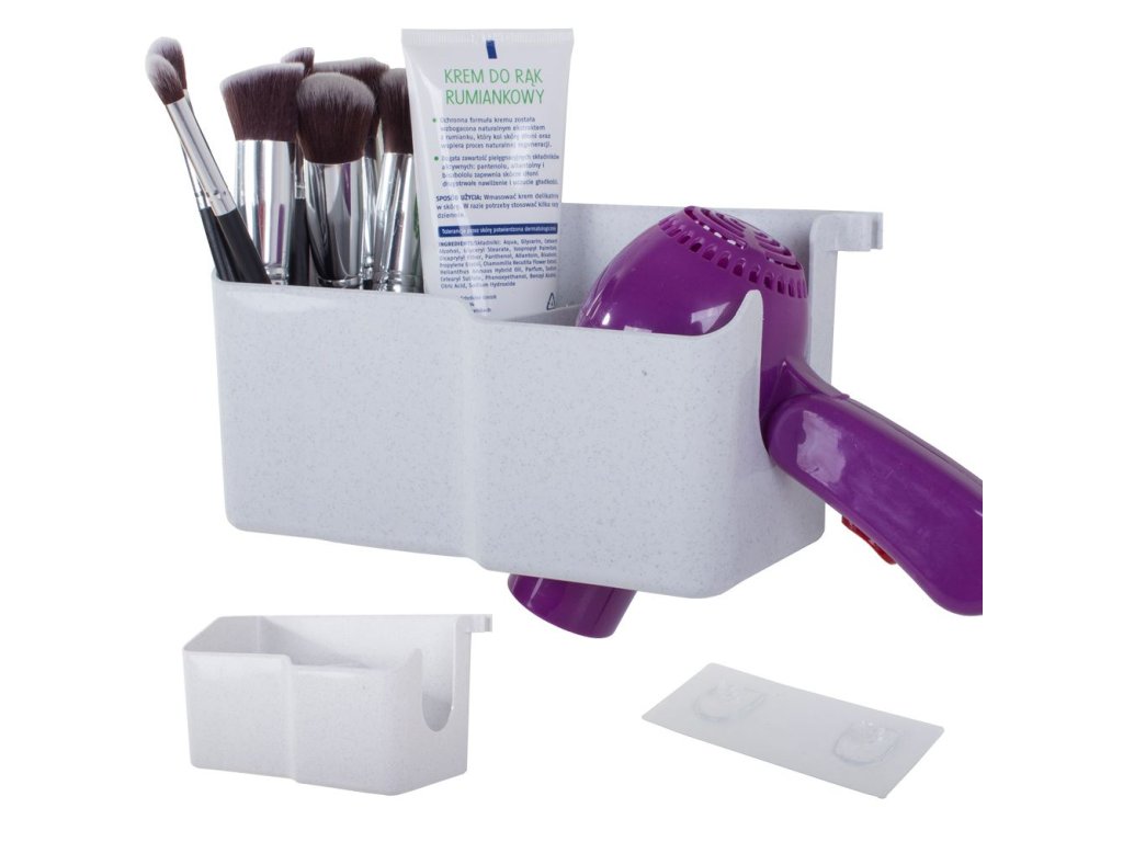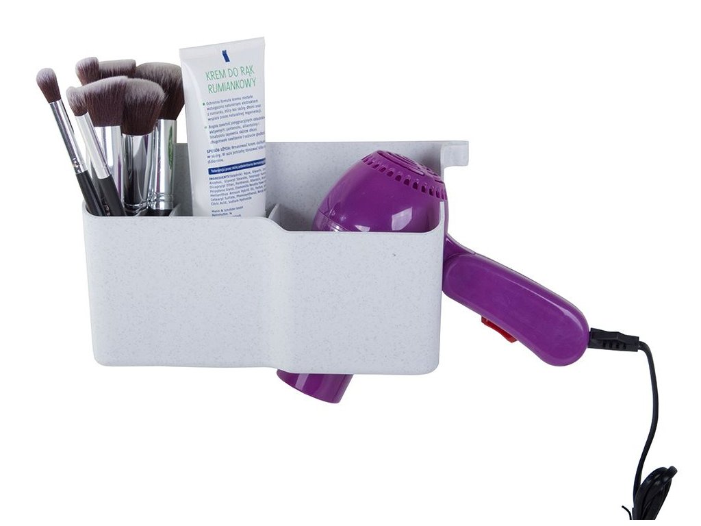 Nástěnný držák na fén ušetří místo v koupelně. Je vybaven držákem kabelu, 3 přídavnými přihrádkami na různé kosmetické přípravky nebo doplňky a 2 přídavnými malými věšáky, např. na gumičky do vlasů nebo žínku. Díky velkému otvoru ve spodní části rukojeti se snadno vejde do většiny sušiček.