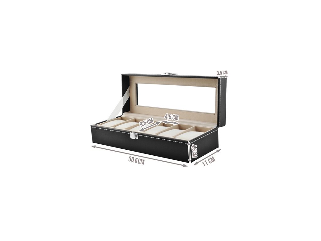 Tato elegantní krabička na hodinky má šest přihrádek, které jsou ideální pro uložení nejen hodinek, ale i dalších šperků. Krabička se vyznačuje elegantní černou povrchovou úpravou s viditelným světlejším prošíváním, které jí dodává nádech elegance a stylu. Víko pouzdra na hodinky je průhledné (akrylové sklo), což umožňuje používat krabičku nejen k uložení, ale i k elegantnímu vystavení jejího obsahu. Zakoupením krabičky na hodinky se stanete skvělým a užitečným dárkem, který jistě každý ocení.