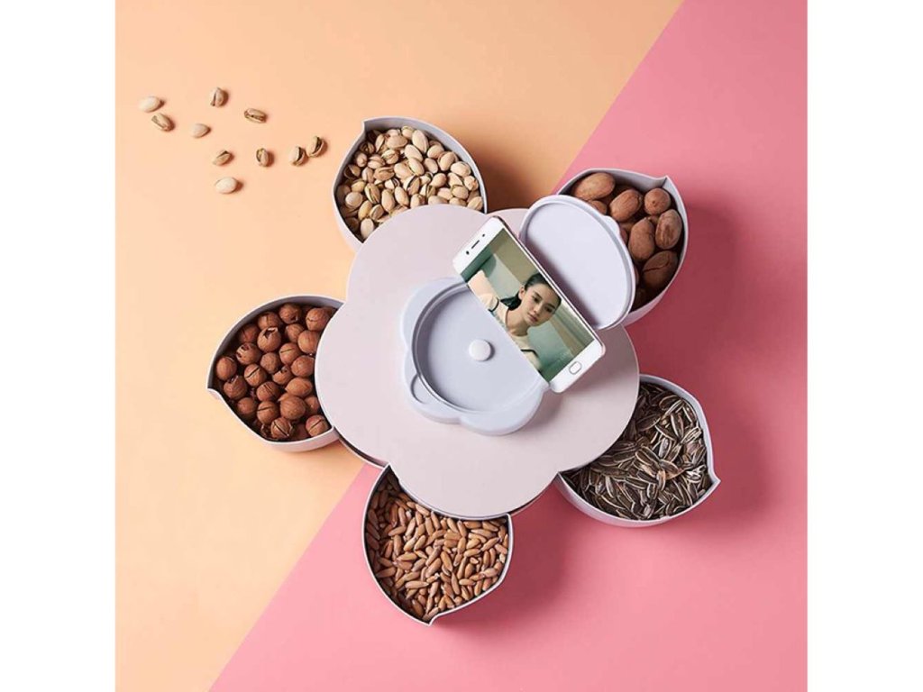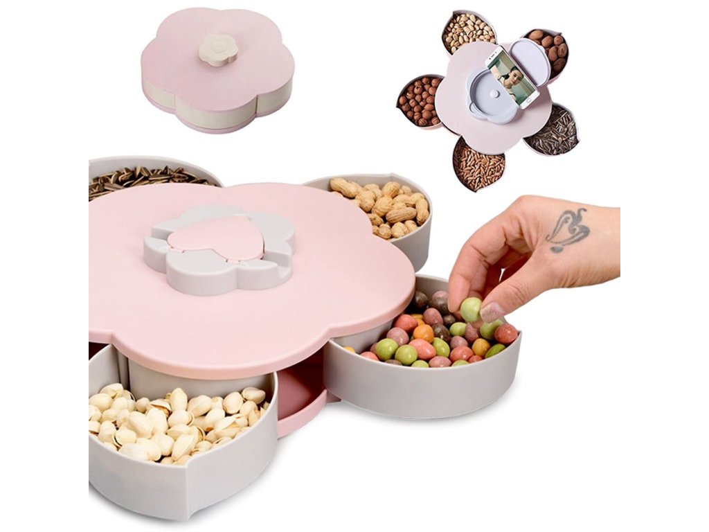 Otočný květinový organizér je dělený , takže můžete ukládat různé pochutiny jako slunečnicová semínka, sušené ovoce, oříšky, chipsy, olivy a další pochutiny.