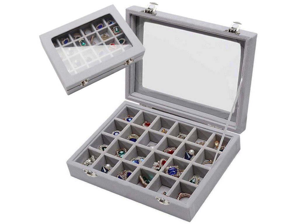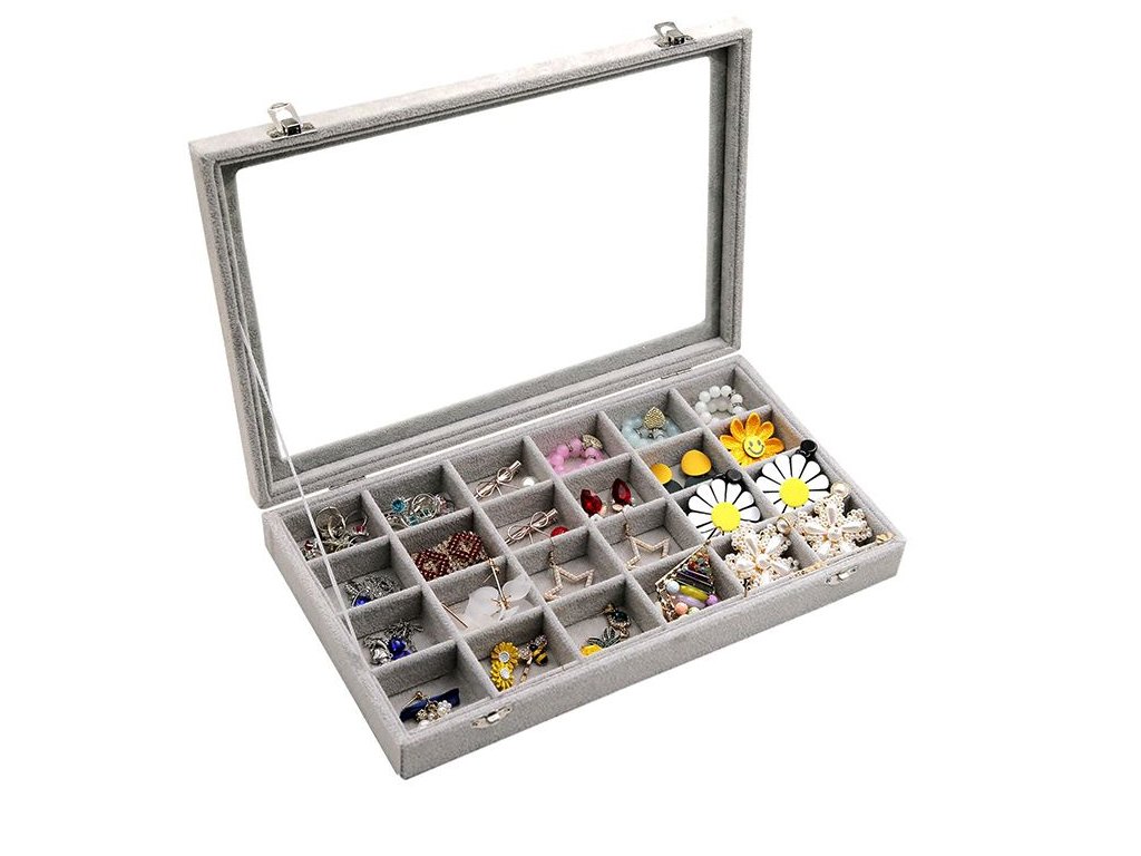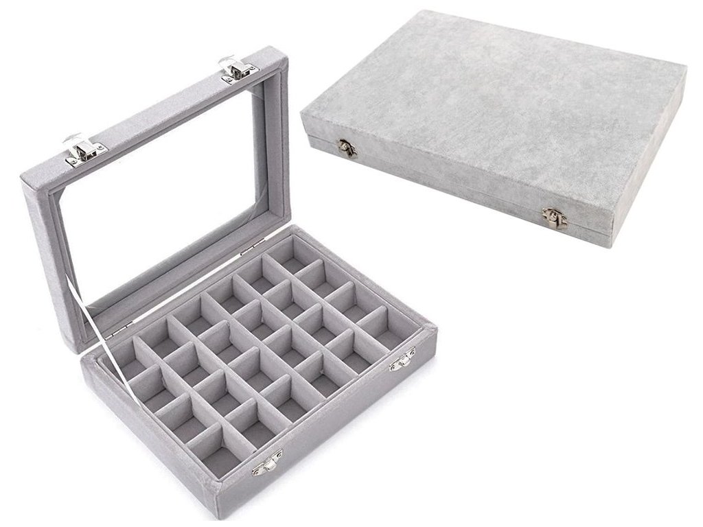 Skleněné víko kazety umožňuje vystavit celý obsah organizéru , což je užitečné nejen doma, ale i ve šperkařství nebo zastavárně.
