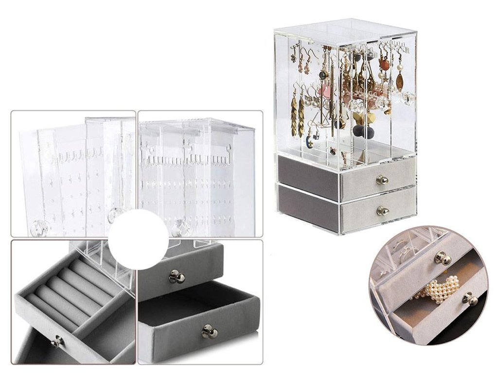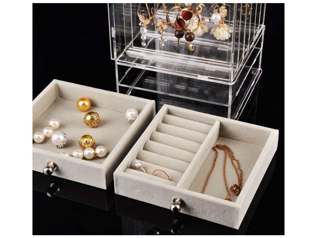 V horní části se nachází vitrína se třemi svislými zásuvkami, ve které budou náušnice, řetízky nebo náramky vypadat velmi pěkně.