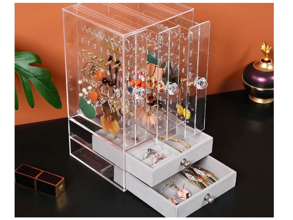 Průhledný materiál umožňuje vystavit celý obsah organizéru , což se hodí nejen doma, ale i ve šperkařství nebo zastavárně.