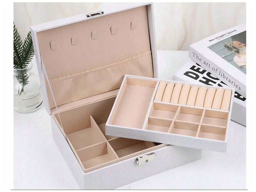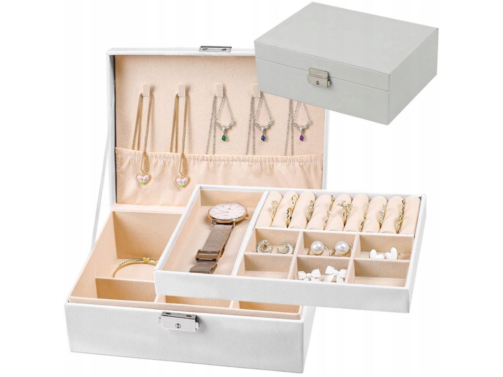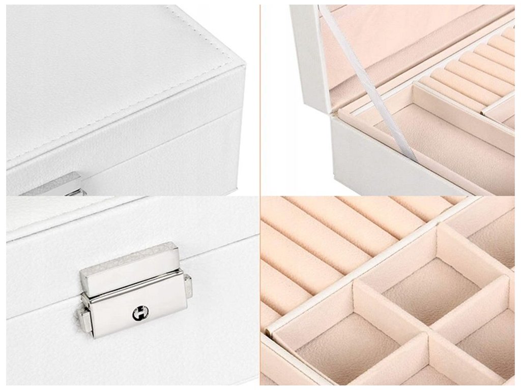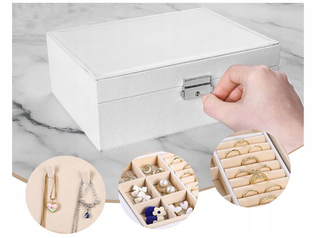Velká, velmi prostorná schránka pro uspořádání všech typů šperků a hodinek. Organizér je vybaven různými typy a velikostmi přihrádek , které úspěšně pojmou velké množství prstenů, řetízků, náušnic, náramků atd.