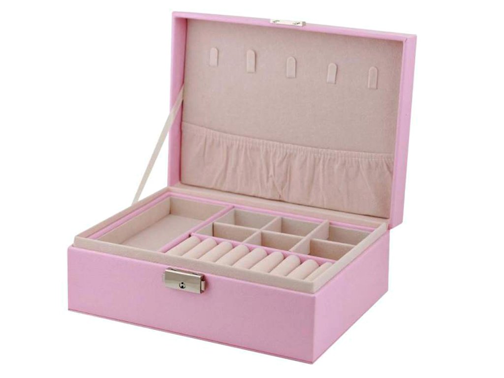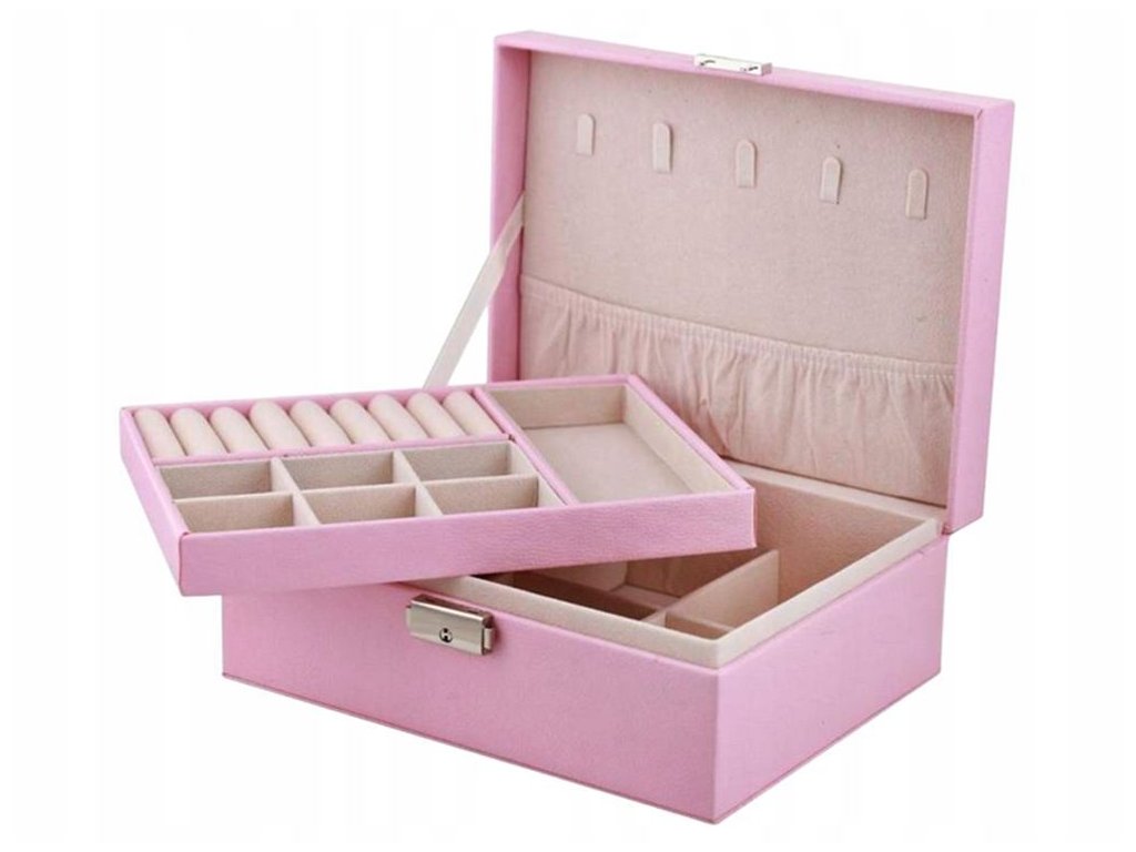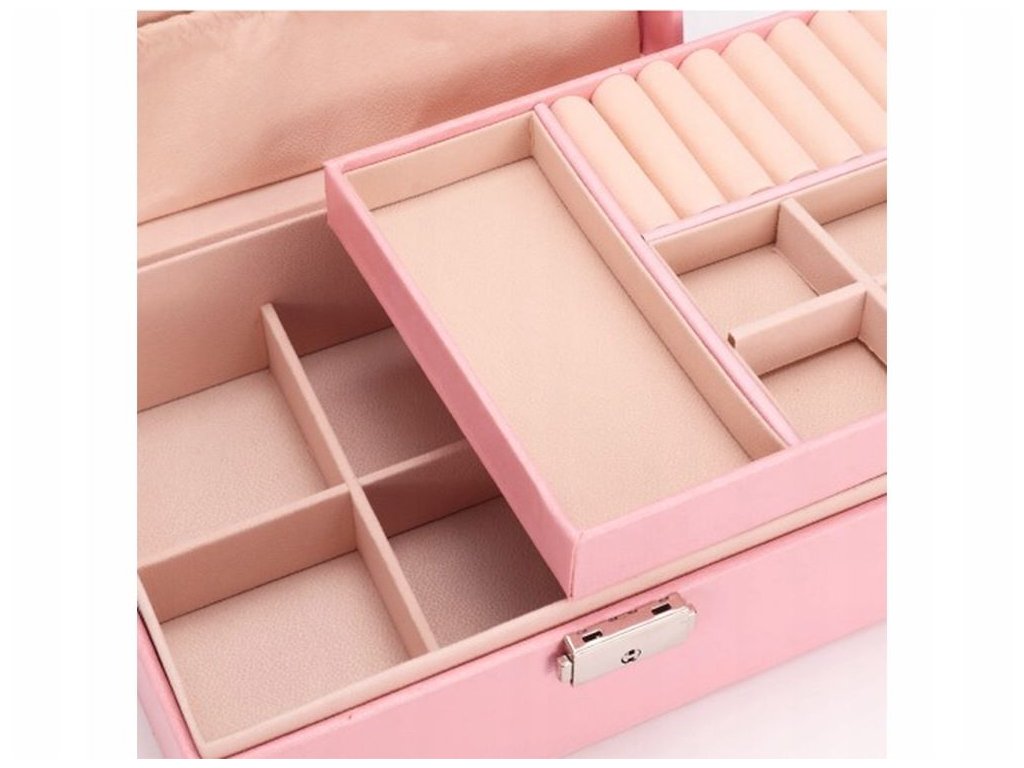 Velká, velmi prostorná schránka pro uspořádání všech typů šperků a hodinek. Organizér je vybaven různými typy a velikostmi přihrádek , které úspěšně pojmou velké množství prstenů, řetízků, náušnic, náramků atd.