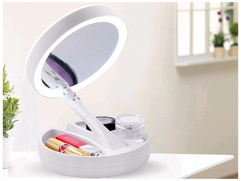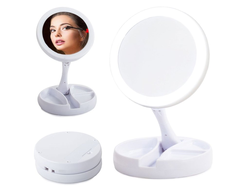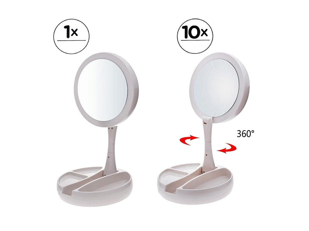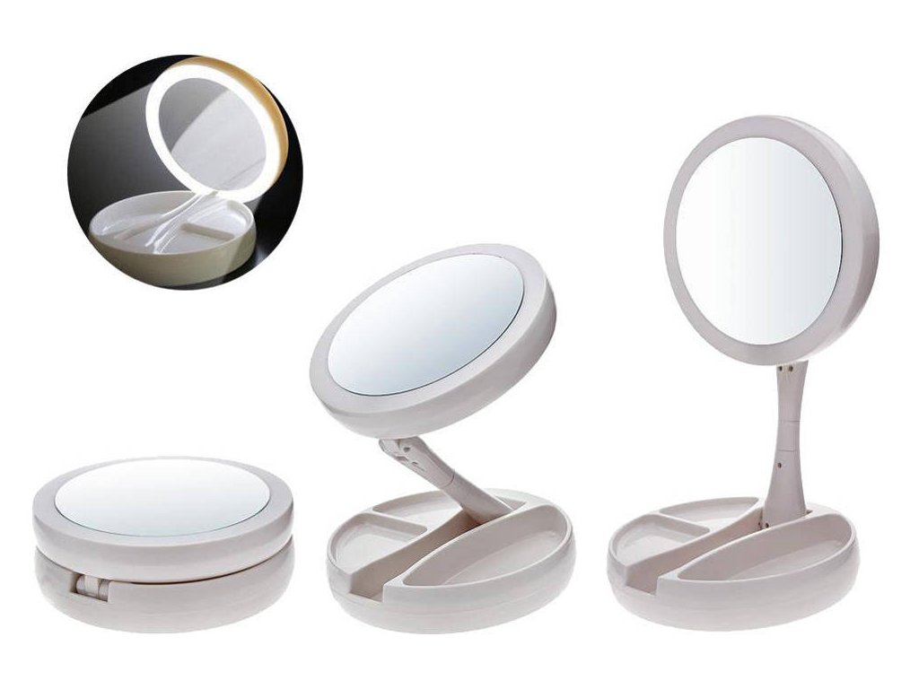 Osvětlené zrcátko je velmi praktické a mimořádně užitečné zařízení pro kosmetické ošetření, líčení nebo nasazování kontaktních čoček. Má funkční přihrádky, kam si můžete odložit šikovnou kosmetiku. Na jedné straně je zrcadlo v životní velikosti a na druhé straně má desetinásobné zvětšení. Podle potřeby můžeme zrcadlo natočit na jednu nebo druhou stranu.