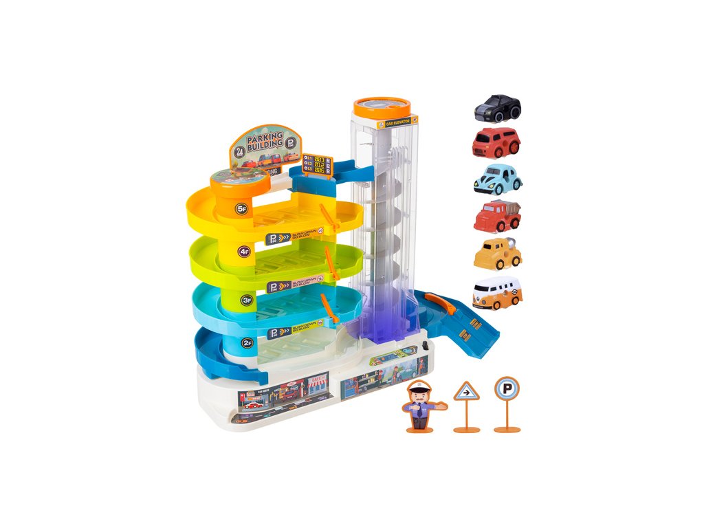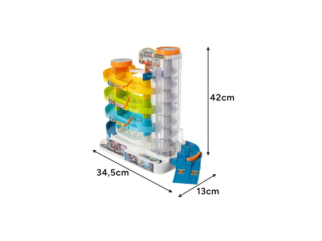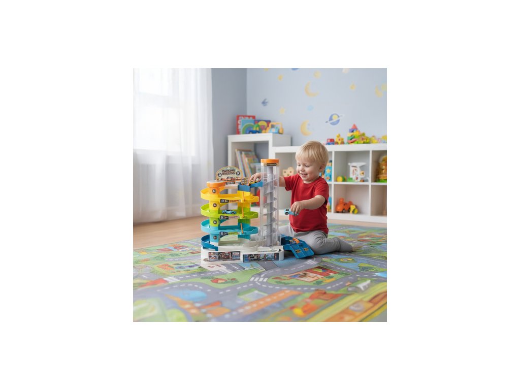 Nabízíme unikátní parkoviště, které vaše dítě přenese do světa zábavy a fantazie. Spirálový výtah s možností ručního nebo elektrického ovládání rychle vyveze auta do nejvyššího patra a poté sestoupí po celé pětipatrové koleji přímo k výtahu. Jedná se o perfektní hračku pro děti od 3 let, která kombinuje zábavu s učením principů pohybu a koordinace.