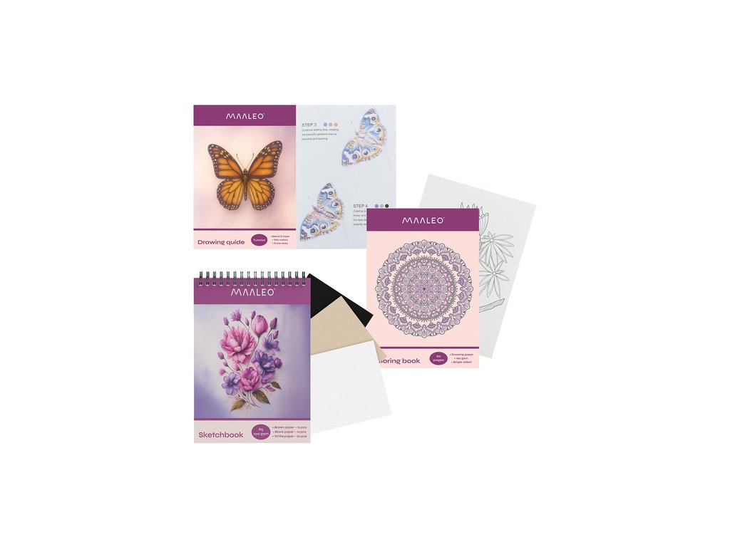 Skicář, omalovánka a kreslicí sešit součástí balení - Sada obsahuje omalovánku, skicář s tlustým uměleckým papírem a knihu s podrobnými lekcemi, které vám pomohou rychle zvládnout techniky kreslení, i když s nimi teprve začínáte.