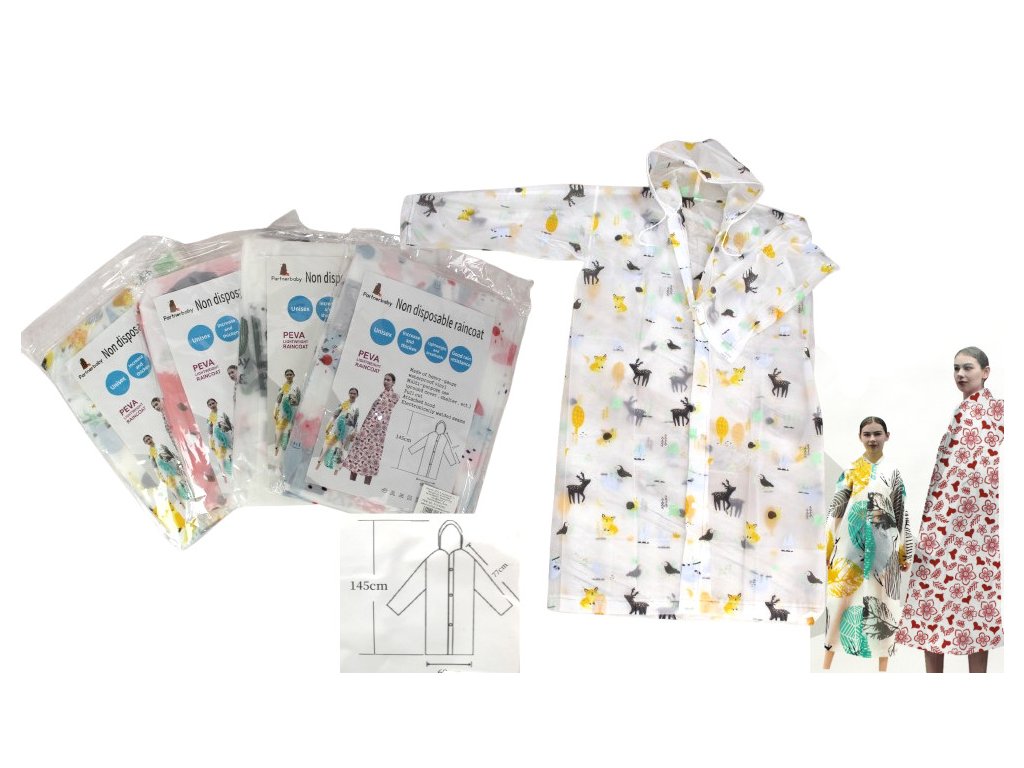 Pláštěnka, déšť, dlouhé rukávy s kapucí, vzory 145 x 68 x 77 cm