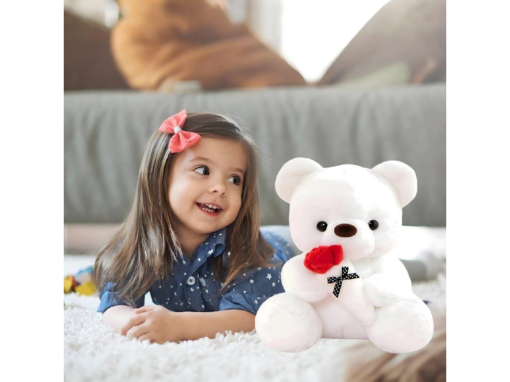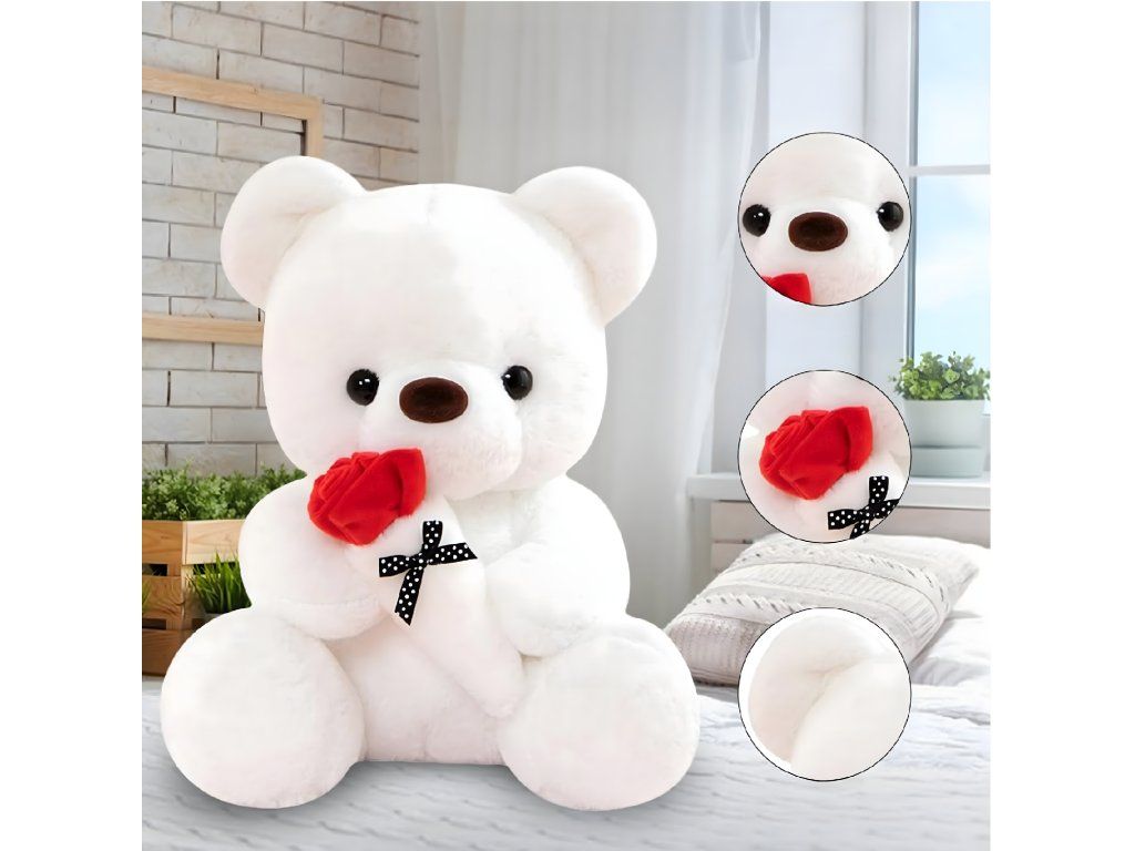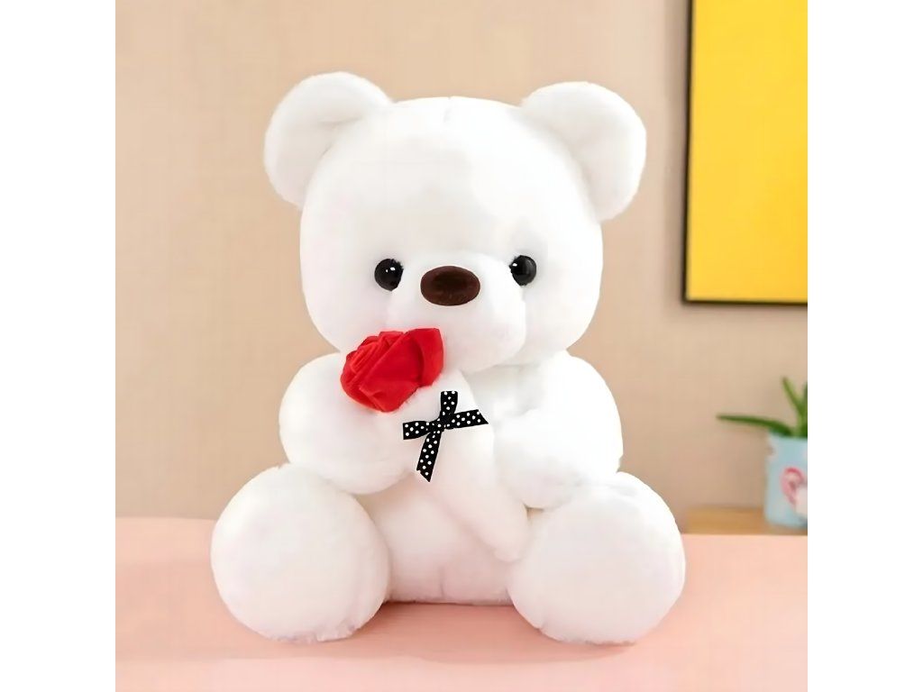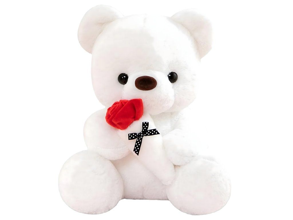 Plyšový bílý medvídek pro dívku 32 cm s červenou růží a mašlí – dárek