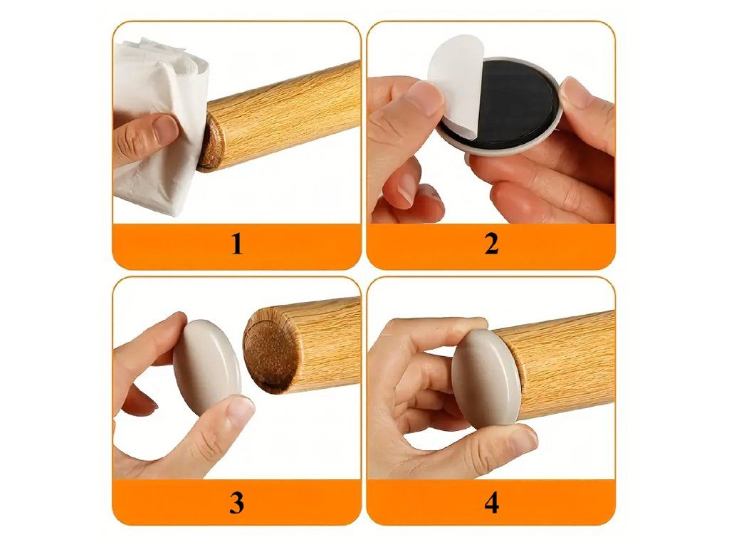 Stačí odlepit ochrannou fólii a podložku přilepit pod nohu nábytku, přičemž ji několik sekund přitlačte.