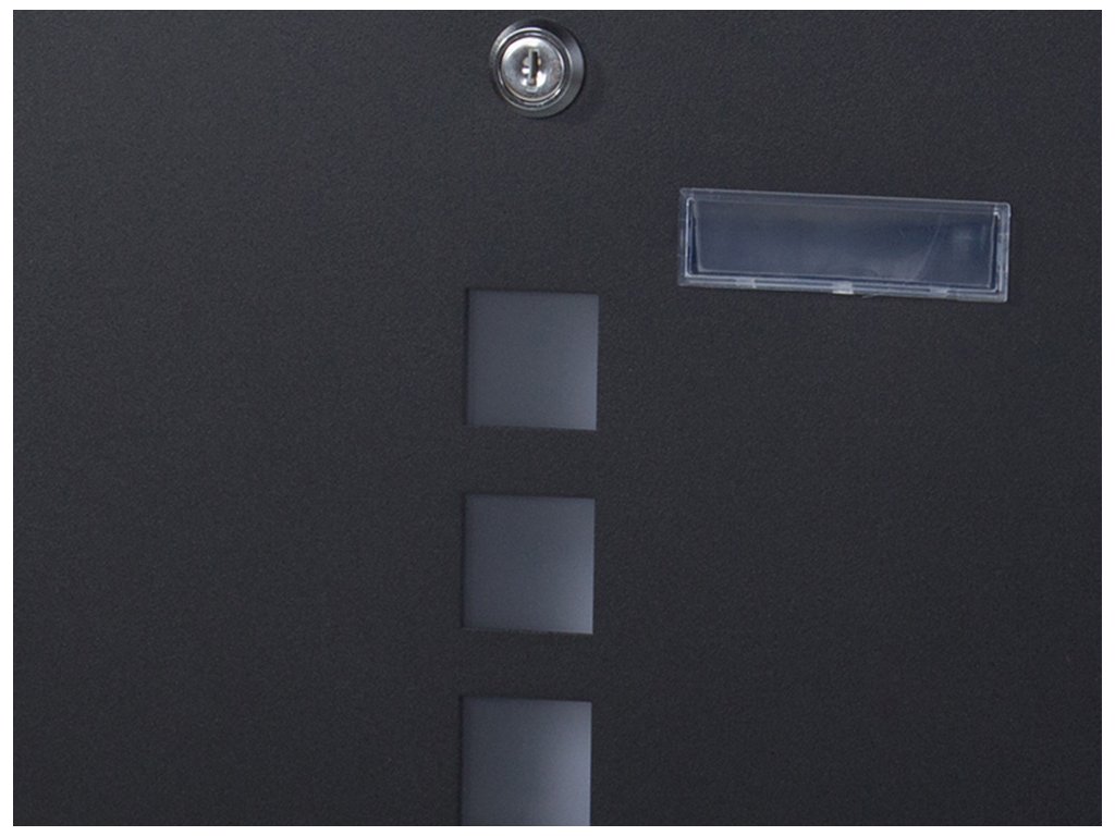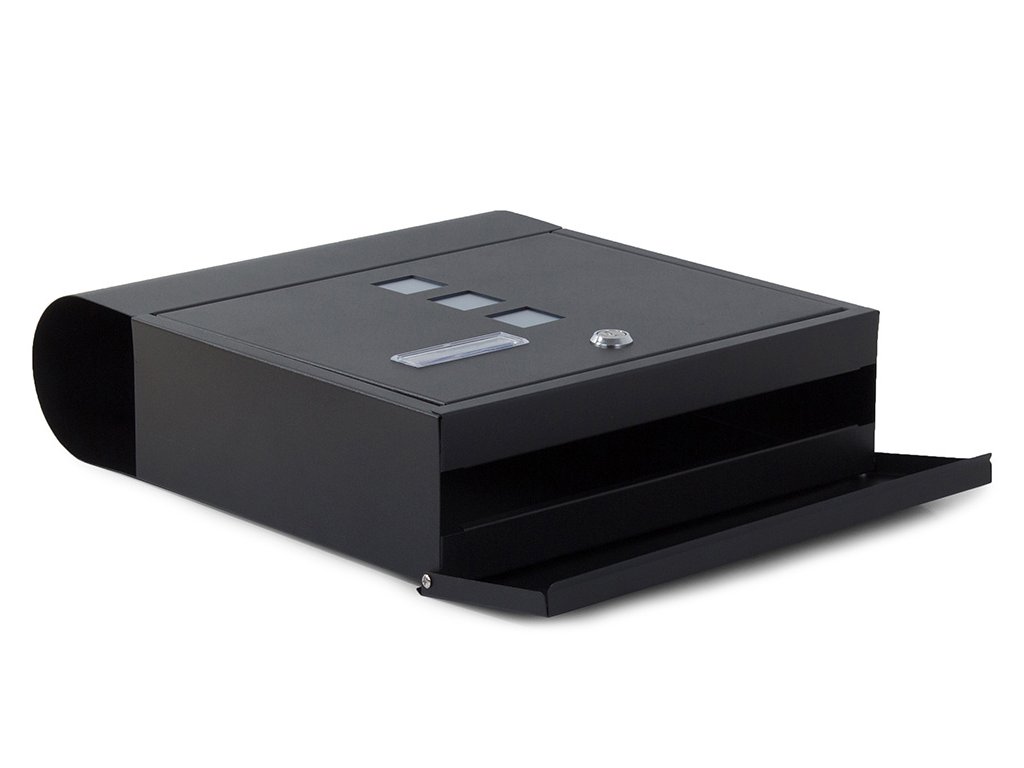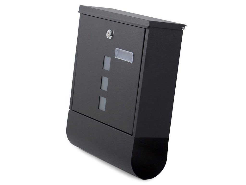 Má další zásobník na noviny, 3 průhledné otvory , kterými můžete zkontrolovat obsah krabice, a okénko pro poznámku s osobními údaji.