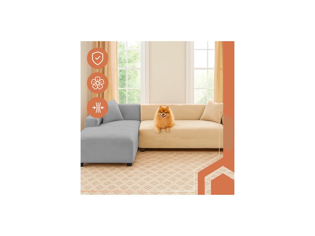 Tento potah RUHHY, vyrobený z měkkého a pružného sametu, je perfektním řešením pro ochranu a osvěžení vaší rohové rozkládací pohovky. Přizpůsobí se tvaru nábytku, drží na místě a dodá vašemu interiéru útulný a elegantní nádech. Béžová barva se hodí k mnoha dekoracím a její velikost je... Rozměry 145 - 185 cm se vejdou na většinu standardních rohových pohovek.