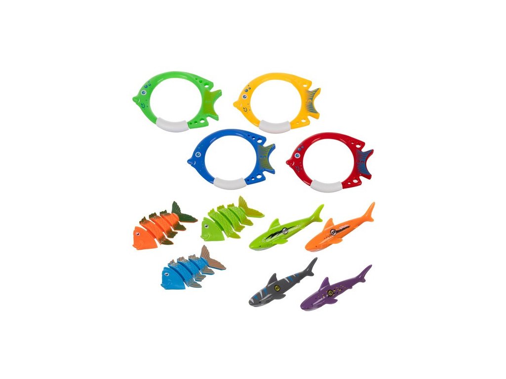 - HRAČKY NA HLEDÁNÍ POD VODOU - sada obsahuje 4 velké barevné ryby vyrobeno z PP, který klesají ke dnu po vhození do vody, pohybující se pohybem vody . Na jejich ocasech jsou bodové značky , které umožňují vstup prvky soutěže při potápění. Navíc jsou součástí sady 3 menší ryby z PVC , perfektní ladí se zbytkem sady a poskytují ještě více zábavy. 4 torpéda ve tvaru žraloka , vyrobené z PVC , s označením pod hřbetní ploutví , jsou ideální pro házení a chytání pod vodou . Jejich aerodynamický tvar umožňuje rychlý pohyb ve vodě , což z nich dělá oblíbený prvek zábavy při potápění.