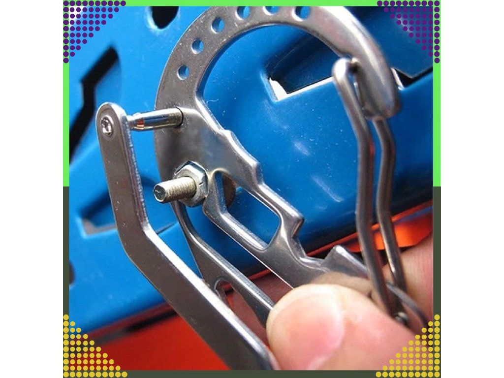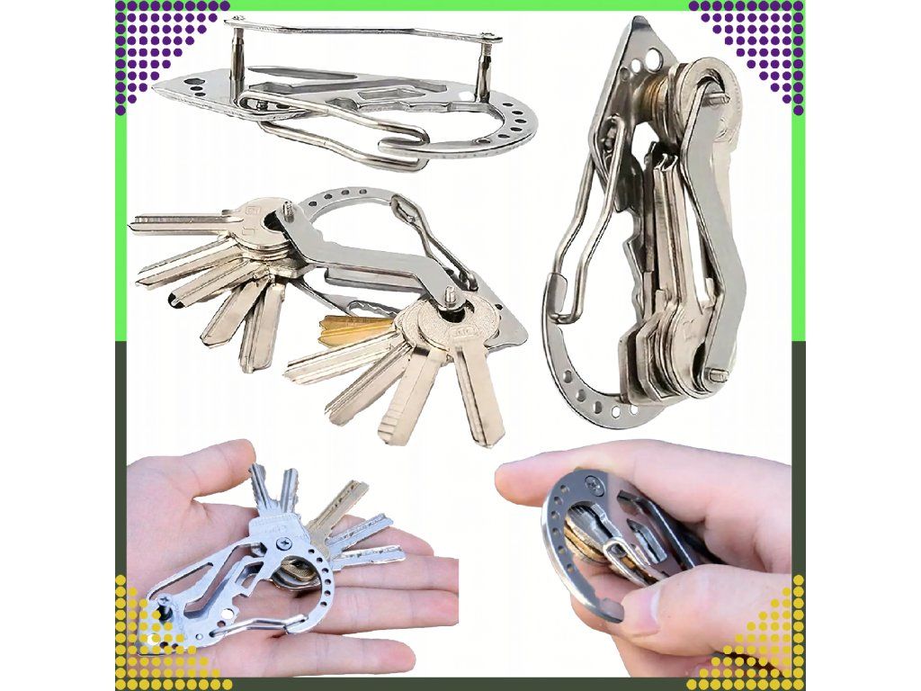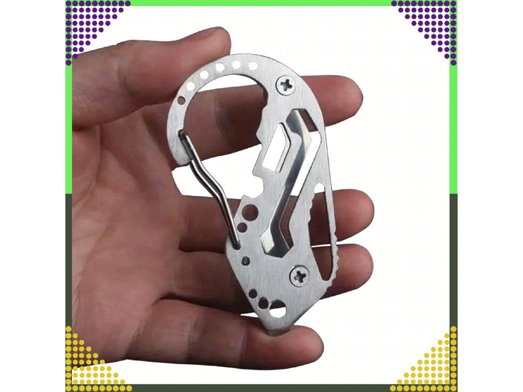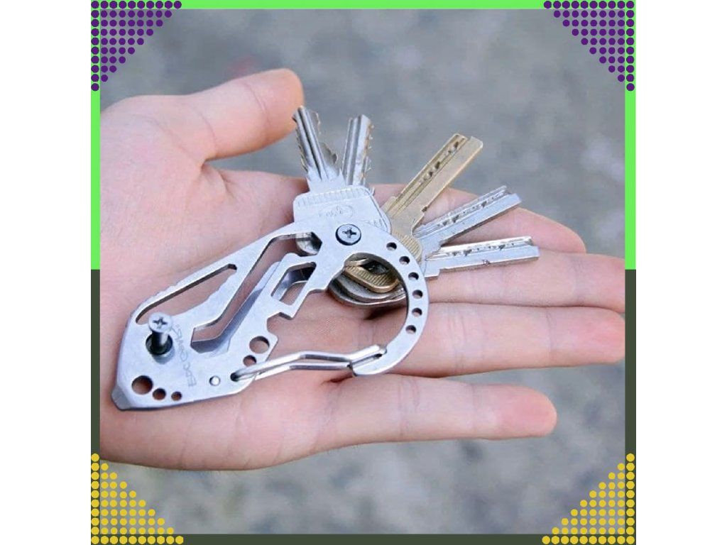 ✔️ Funkce: karabina, spona, organizér na klíče, šroubovák, otvírák na láhve, plochý klíč