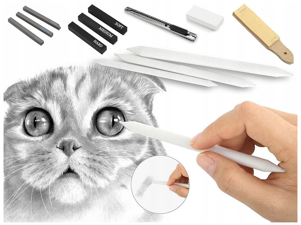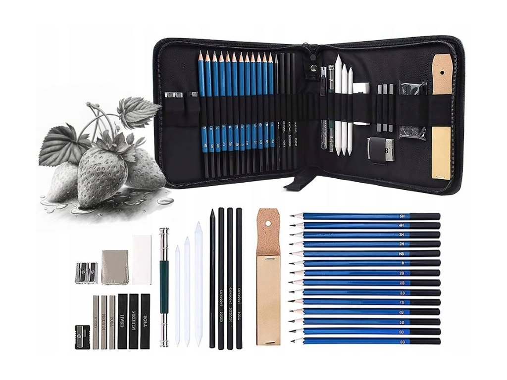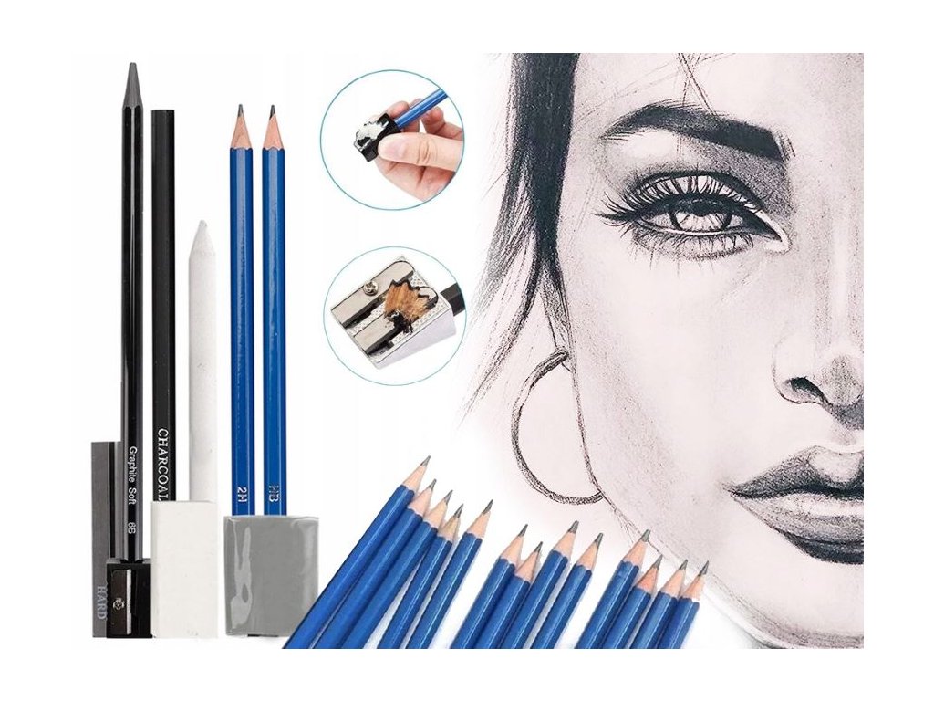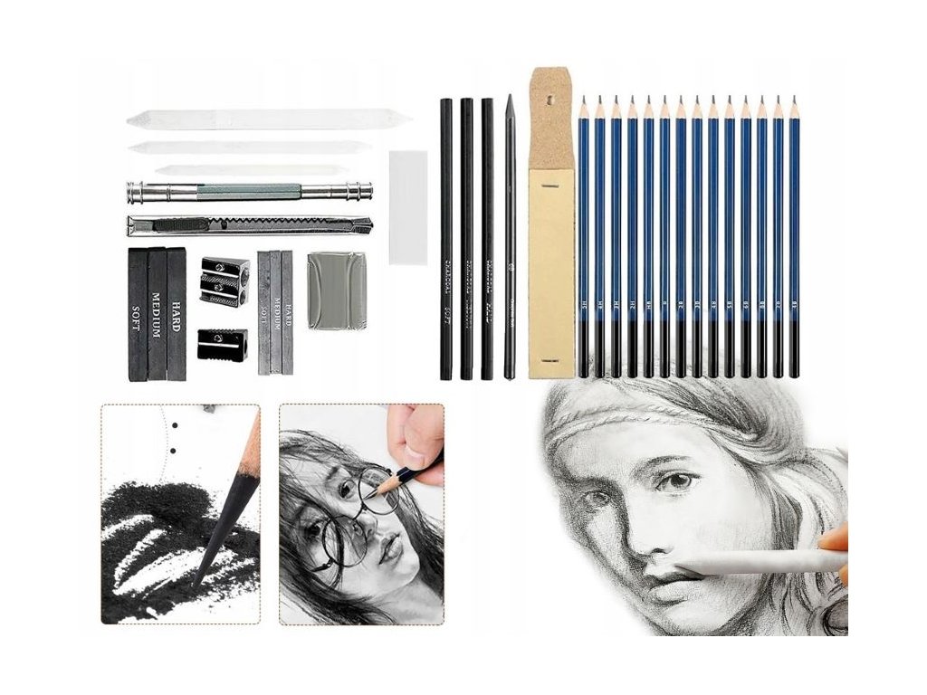Sada obsahuje tužky různé tvrdosti, uhel, grafitovou tužku, grafitové tyčinky, uhelné tyčinky, mixéry, nůž, nástavec, gumy, ořezávátka a blok brusného papíru.