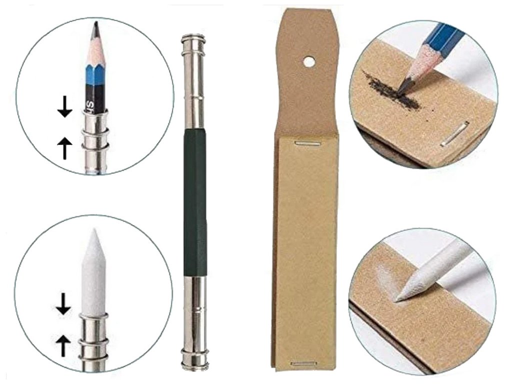 Kovová oboustranná tužka a nástavec na pera, díky kterému můžete každou tužku pohodlně dotáhnout až do konce.