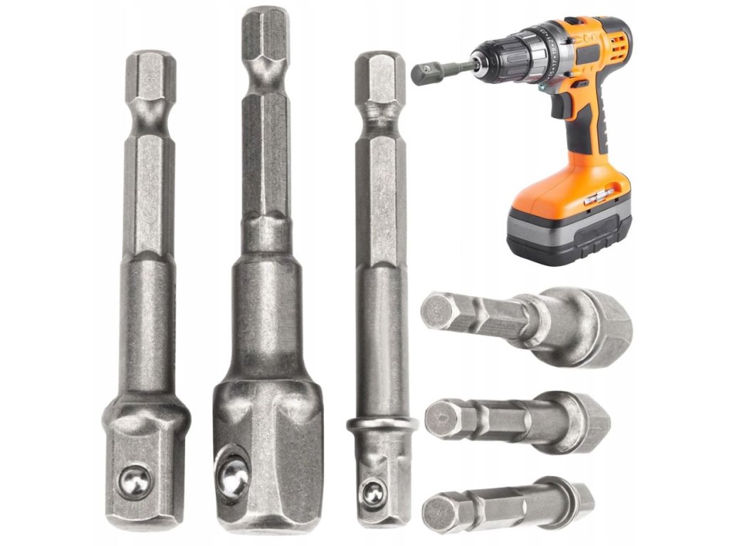 Sada speciálních redukcí, adaptérů pro šroubováky. Redukce umožňují použití šroubováku s nástrčnými hlavicemi. Prvky sady jsou vyrobeny z oceli, což zaručuje jejich pevnost a dlouhou životnost.