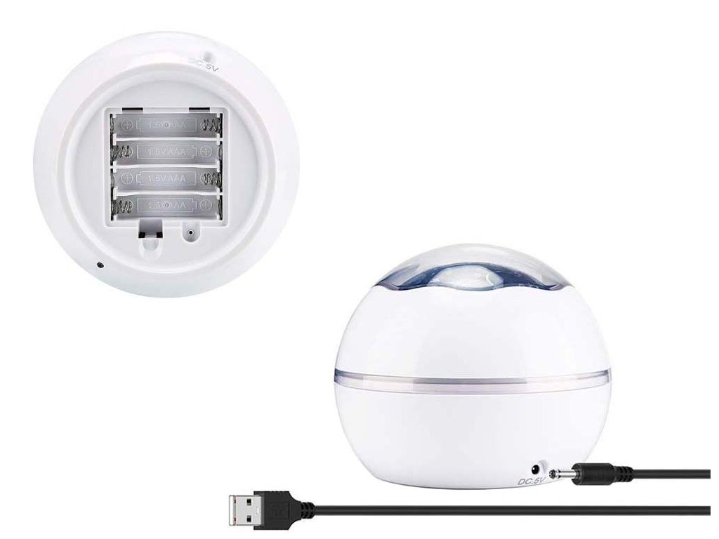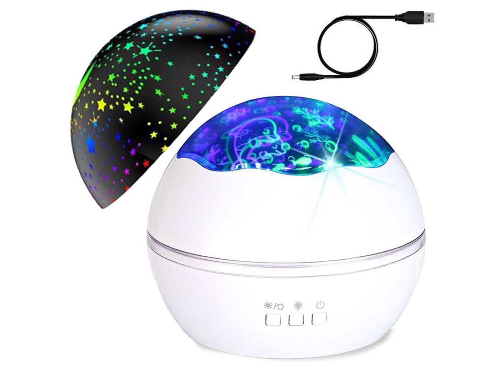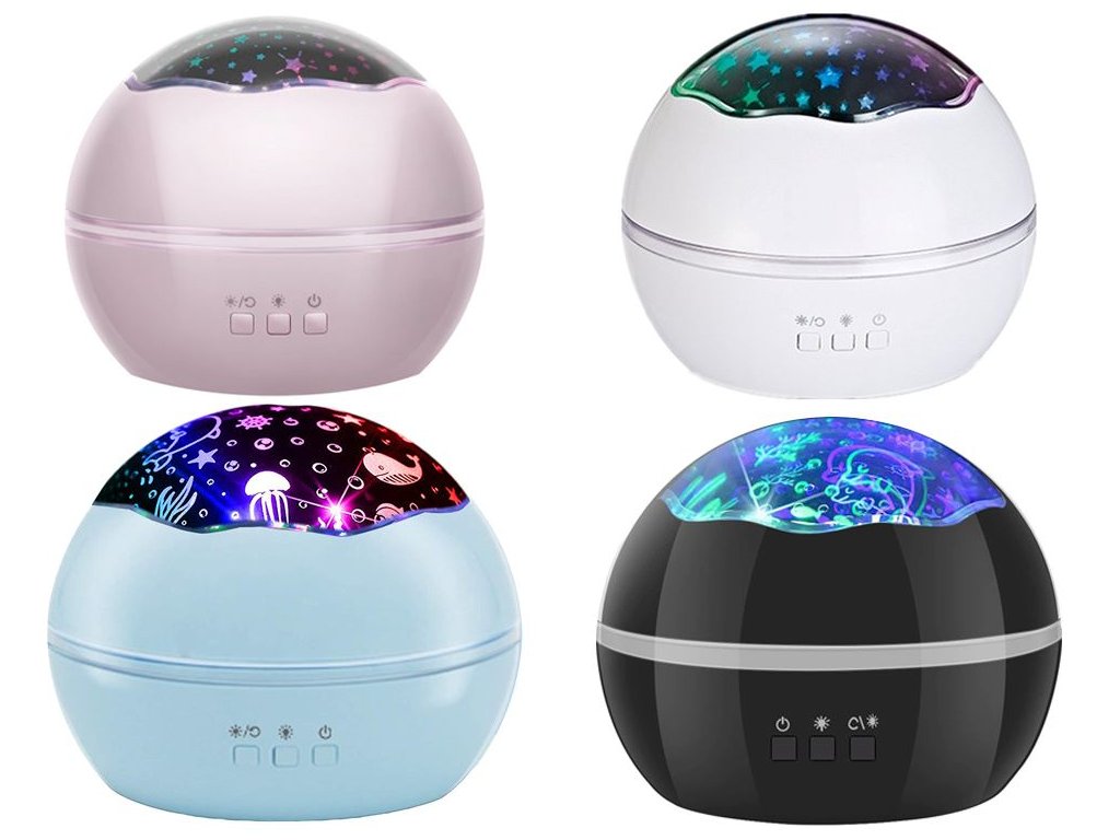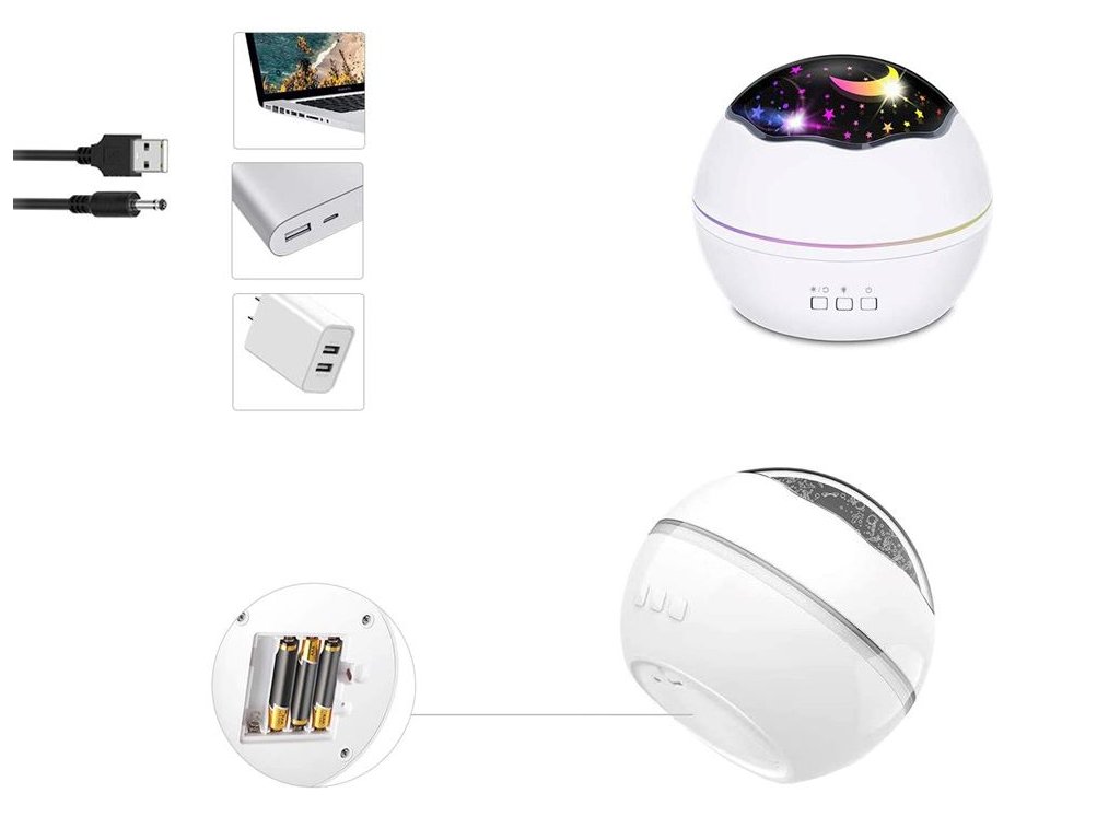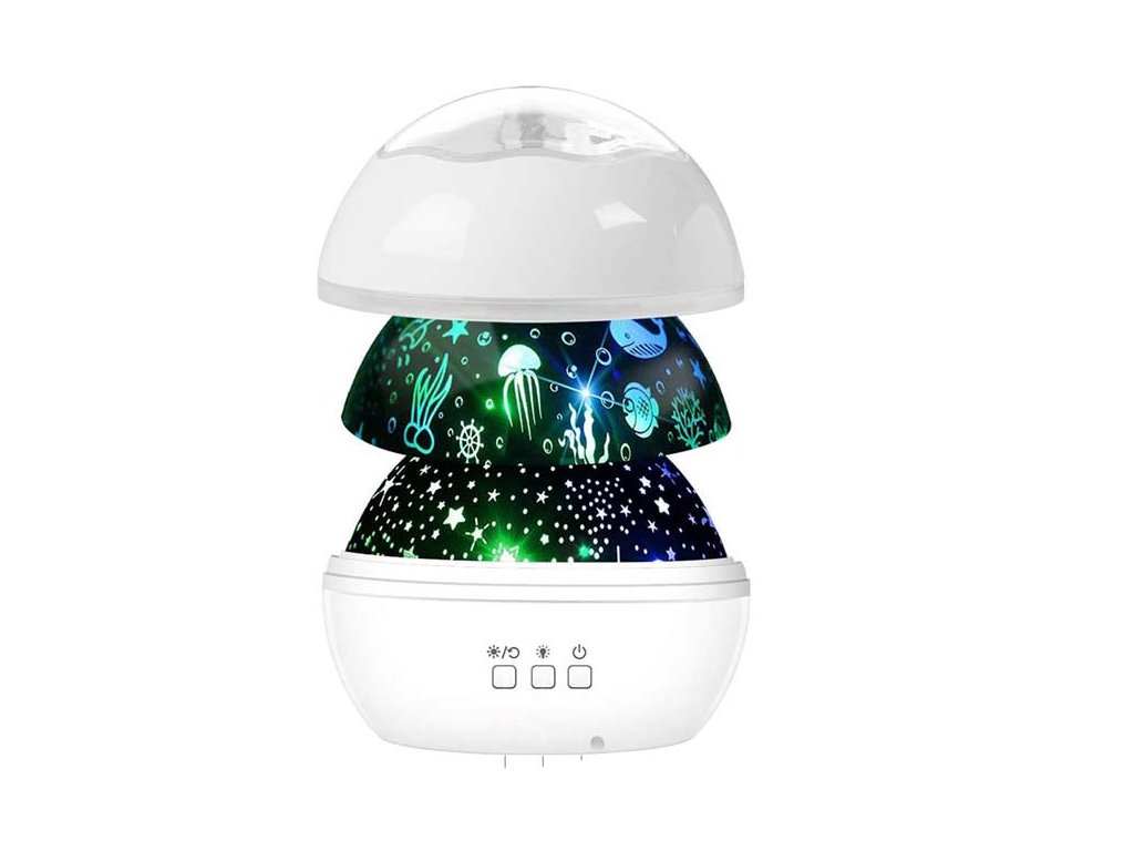 Zařízení se může otáčet a promítat obrázky na strop a stěny a součástí balení jsou dvě překryvné vrstvy: hvězdná obloha a podmořský svět.