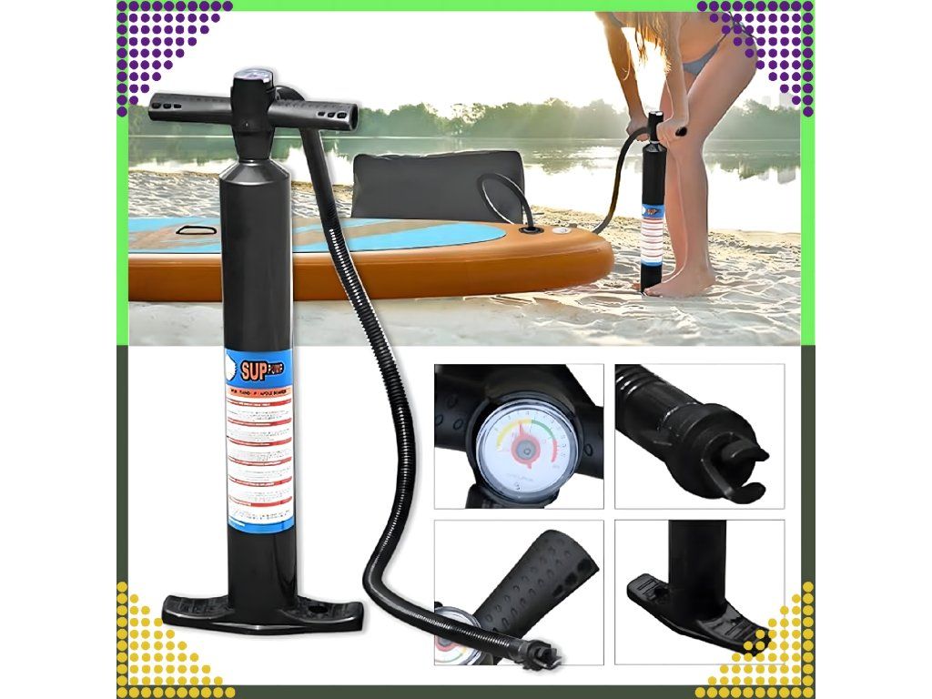 Vysoce kvalitní ruční pumpa na paddleboard, silná a spolehlivá, je nezbytným nástrojem, když se chystáte k vodě zažít nové dobrodružství s deskou SUP. Ruční pumpa usnadňuje nafouknutí desky, aniž byste potřebovali přístup k elektřině. Speciální povrchová úprava zabraňuje erozi, je odolná a pevně vyrobená, aby vám sloužila dlouhá léta.