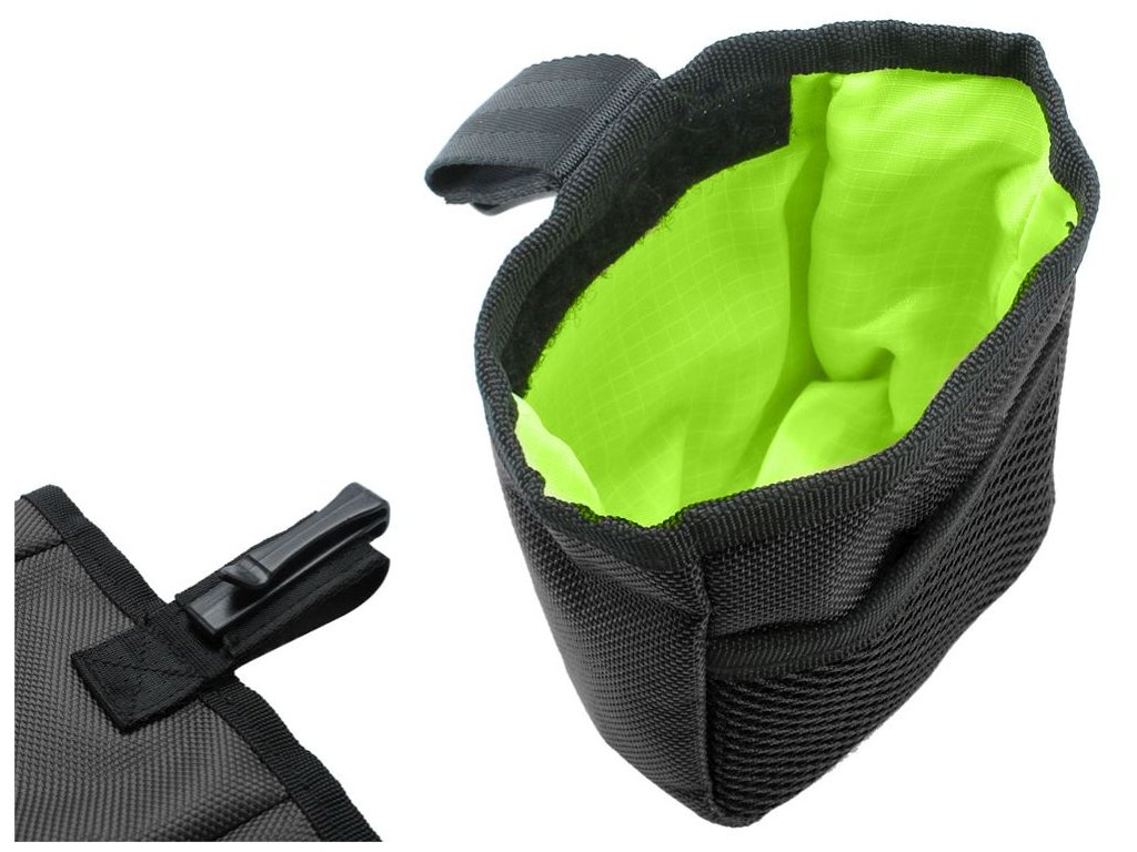 Taška má na přední straně další kapsu, do které můžeme schovat například: sáčky na psí exkrementy. Uzavírá se na suchý zip na vnitřní straně, díky kterému krmivo nevypadne.