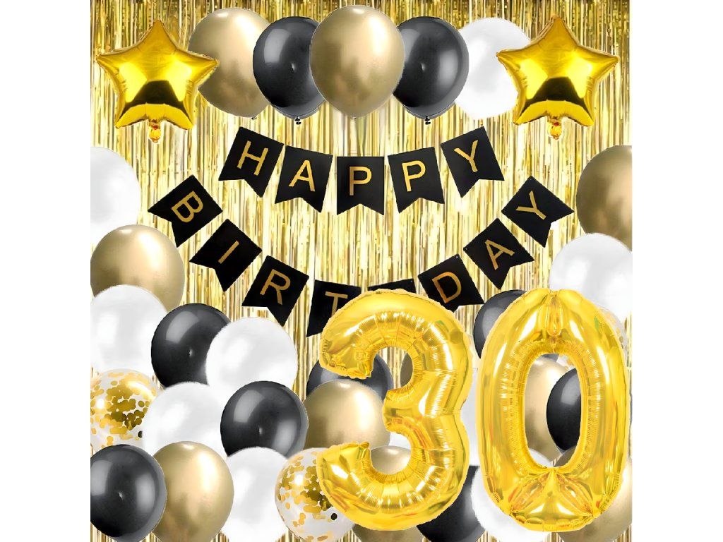 Kompletní sada XXL – 17 černých, 21 zlatých, 9 bílých, 1 s číslicemi „3 a 0”, 2 s konfetami, nápis „Happy Birthday” a zlatá záclona.