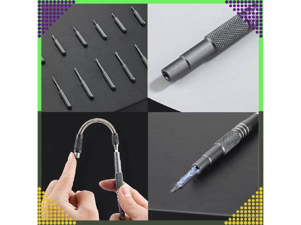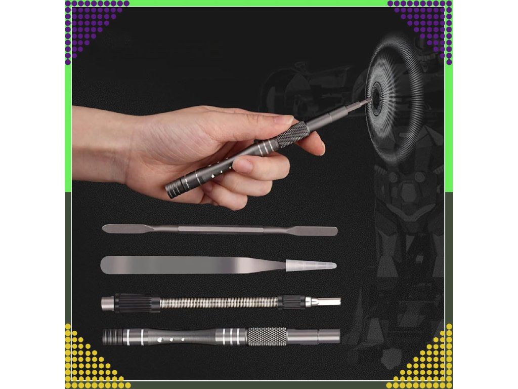 Díky široké škále nástavců a příslušenství je to nenahraditelná sada pro opravy elektroniky, mobilních zařízení, počítačů, brýlí a mnoha dalších přesných úkolů.