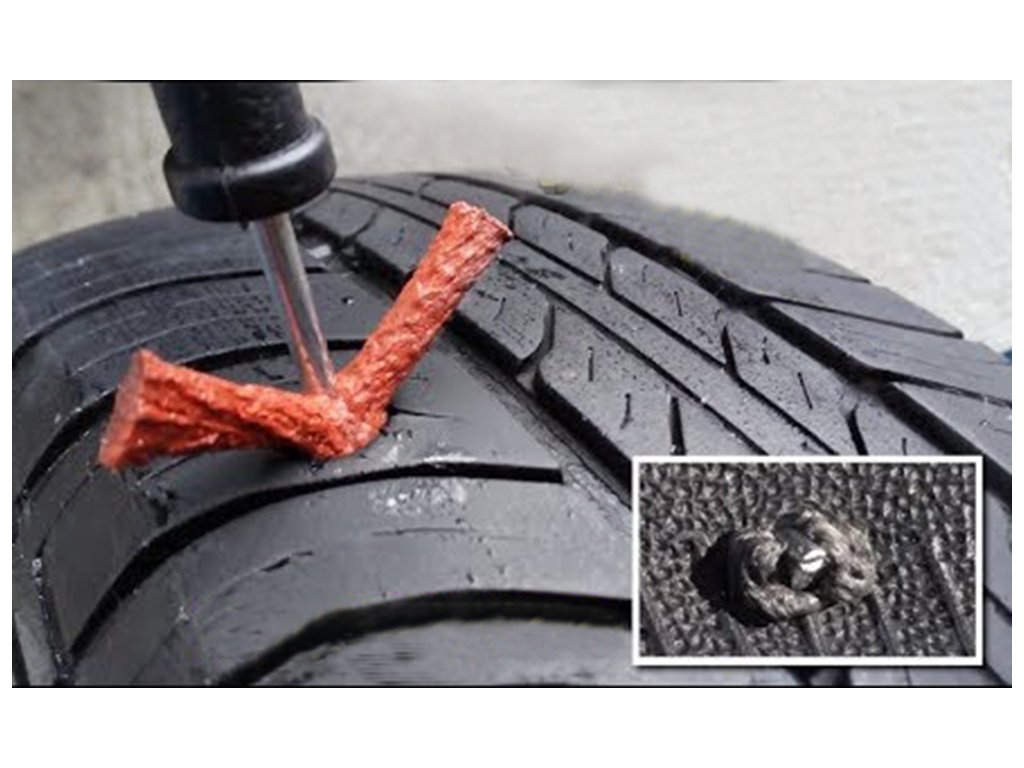 ✅ Potřete frézu přiloženým lepidlem a vložte ji do otvoru po hřebíku podle úhlu, pod kterým hřebík vnikl do pneumatiky, aby otvor dobře vyplnil lepidlem.