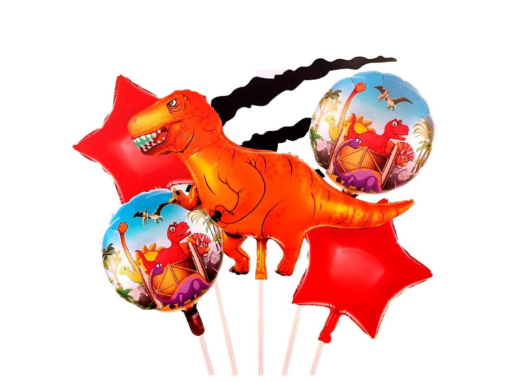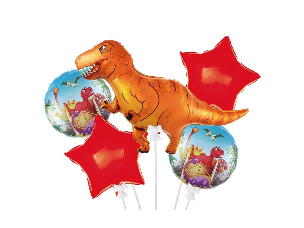 Kompletní sada 5 ks. - 1 balón s motivem dinosaura, 2 kulaté balónky s potiskem, 2 červené hvězdičky.