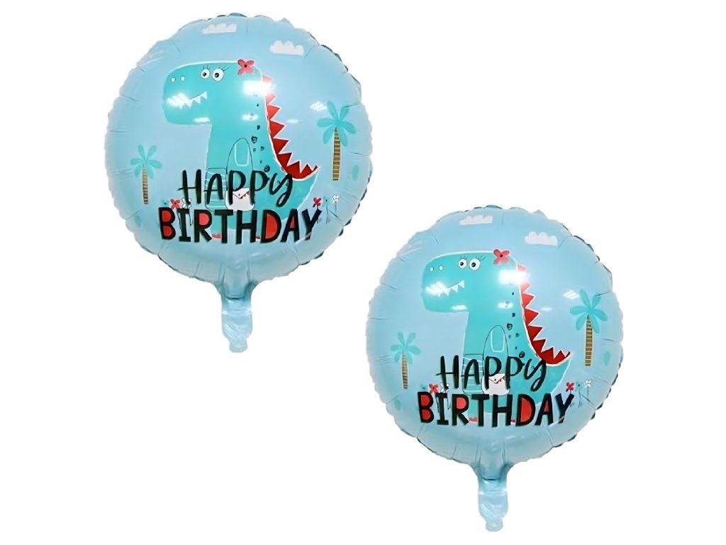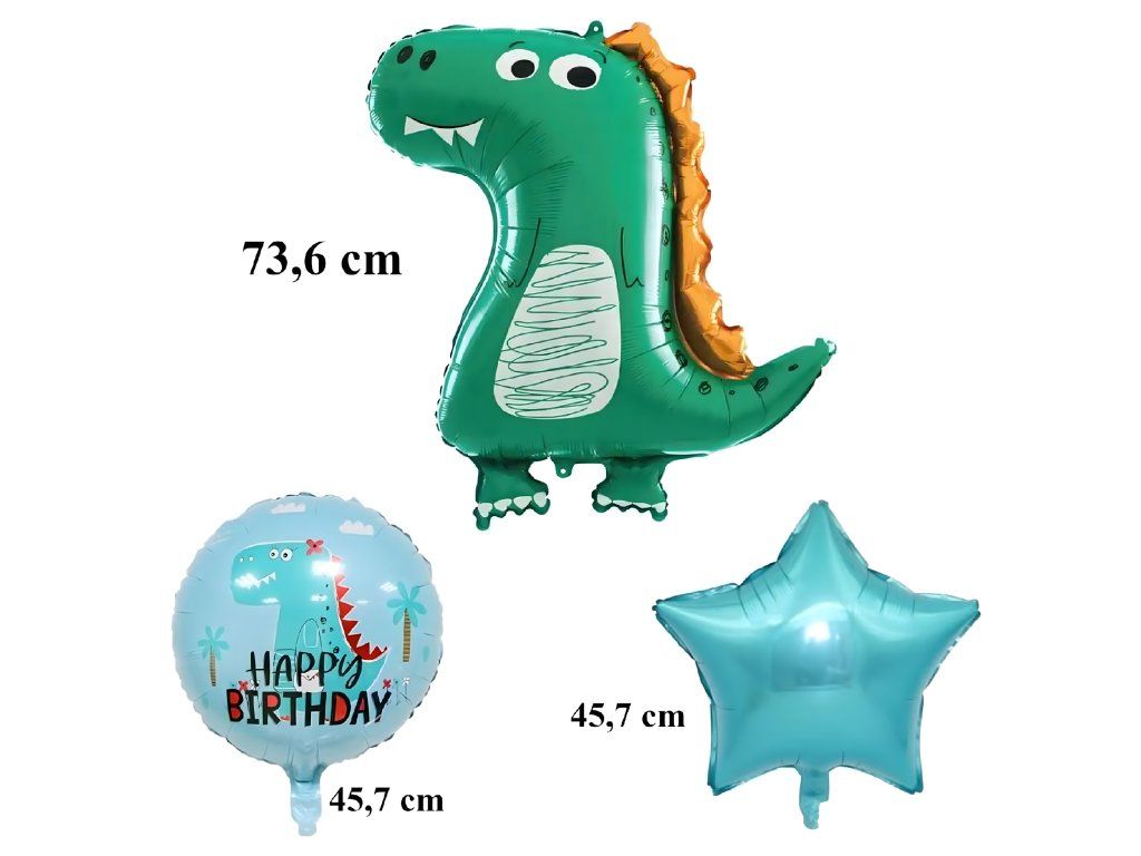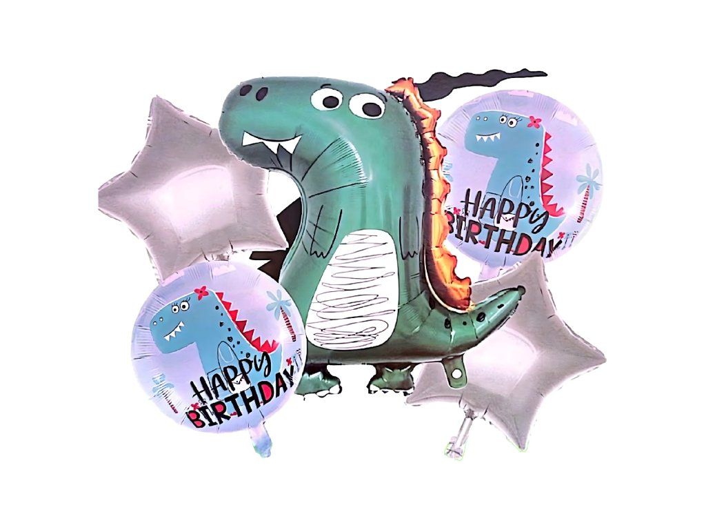 Kompletní sada 5 ks. - 1 balón s motivem dinosaura, 2 kulaté balóny s nápisem „Happy Birthday“, 2 balóny ve tvaru hvězdy.