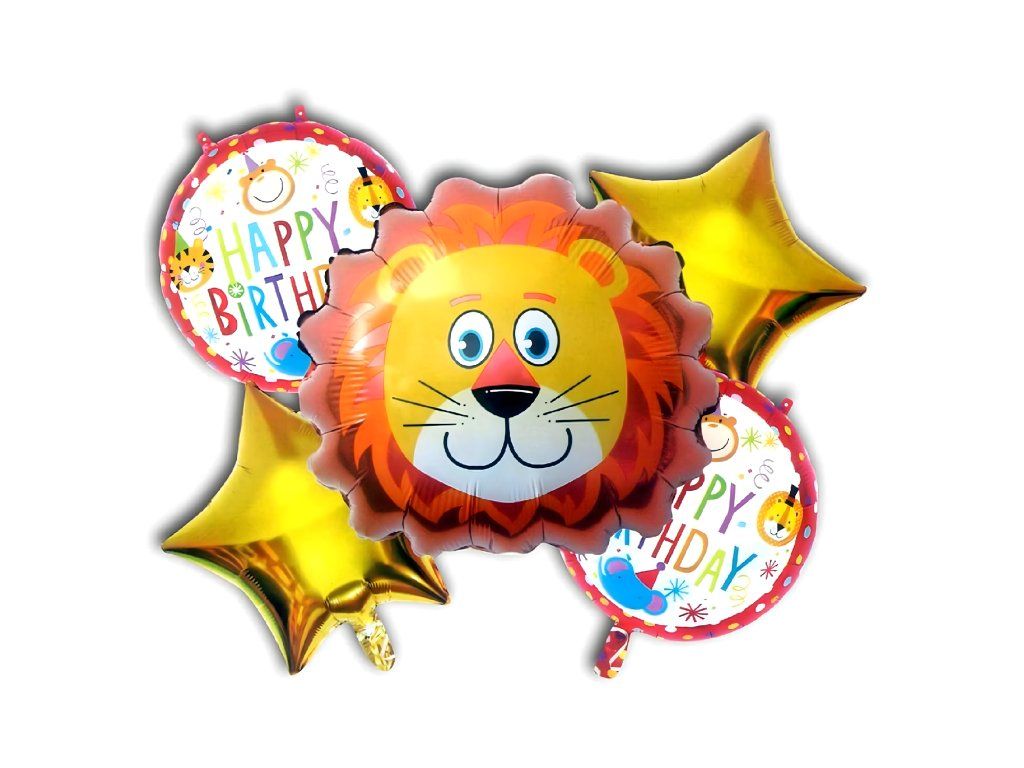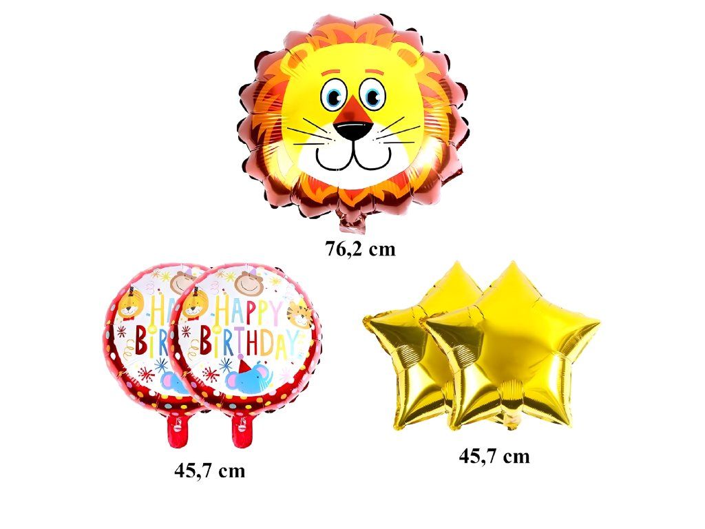 Kompletní sada 5 ks. - 1 balón ve tvaru lva, 2 kulaté „HAPPY BIRTHDAY”, 2 zlaté hvězdičky.