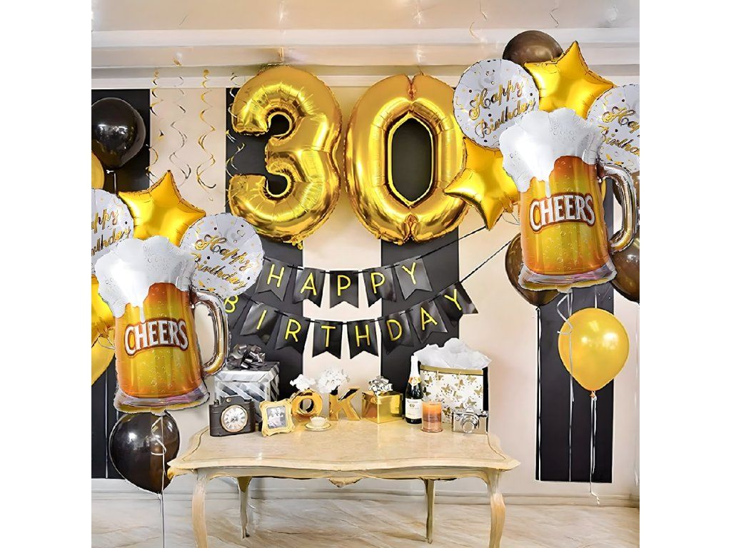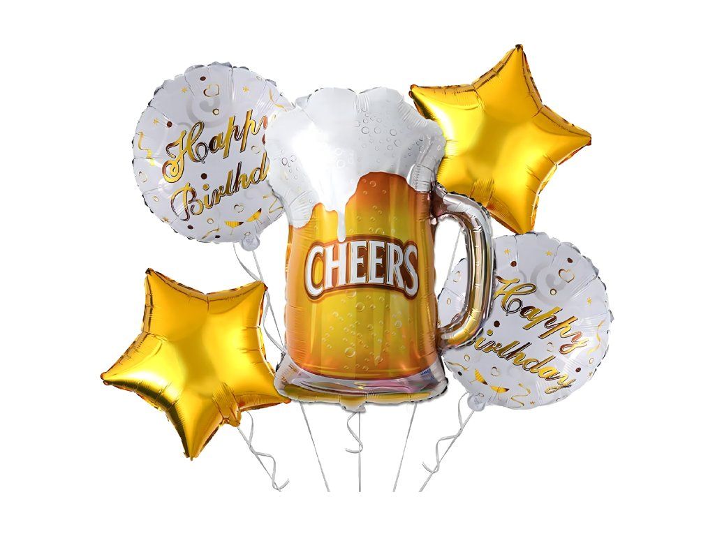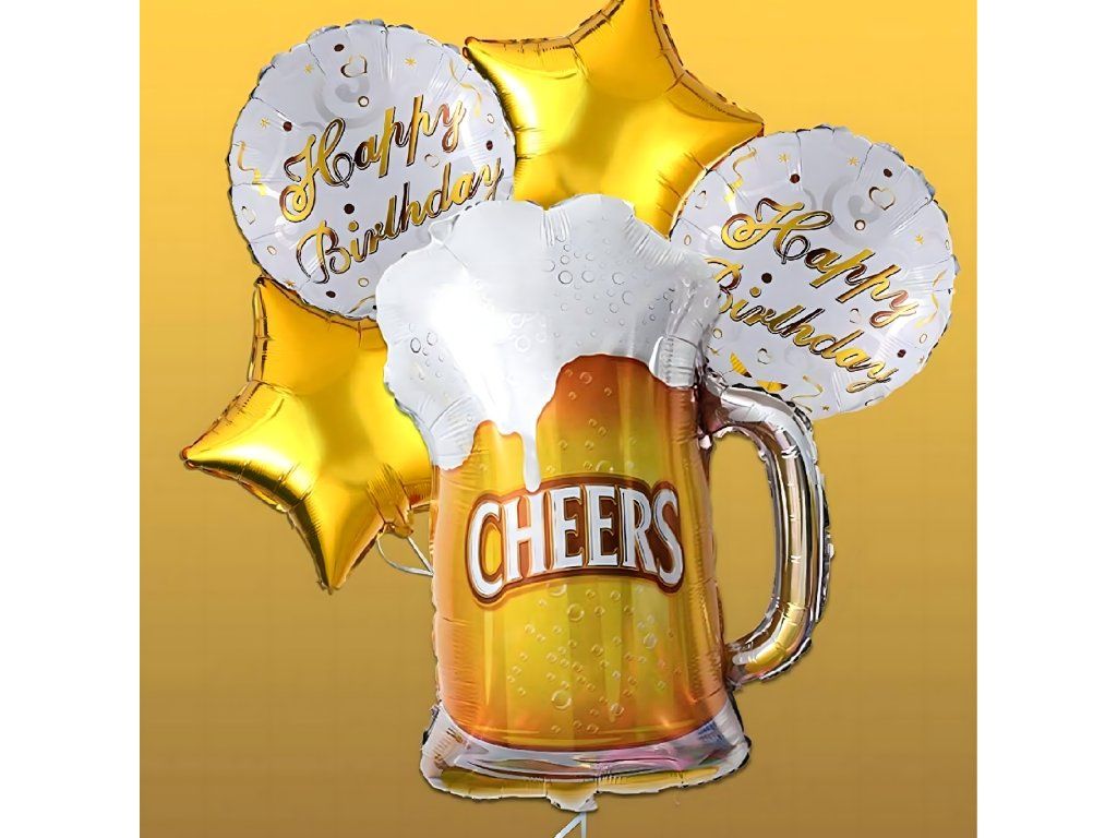 ➡️ 1 balón ve tvaru půllitru piva 63,5 cm „CHEERS”, 2 balóny „HAPPY BIRTHDAY” 45,7 cm, 2 zlaté hvězdičky 45,7 cm.