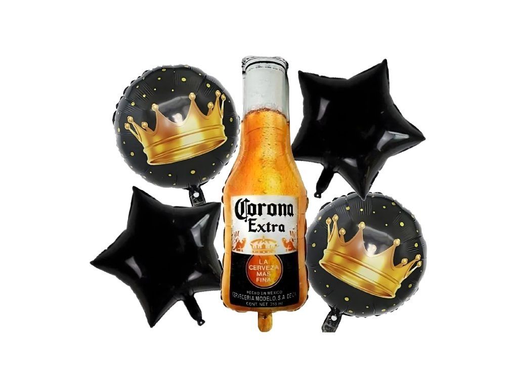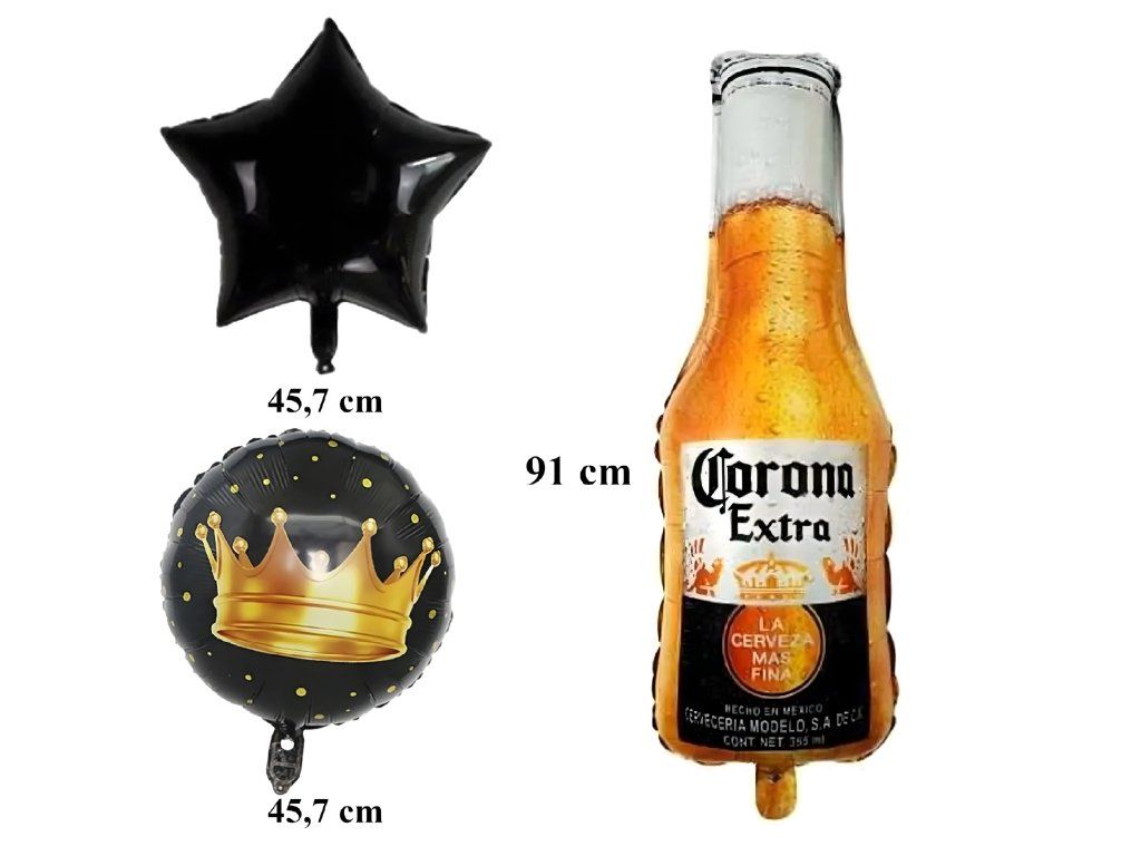 ➡️ 1 balón ve tvaru láhve piva 91 cm „Corona”, 2 balóny „Corona” 45,7 cm, 2 černé hvězdičky 45,7 cm.