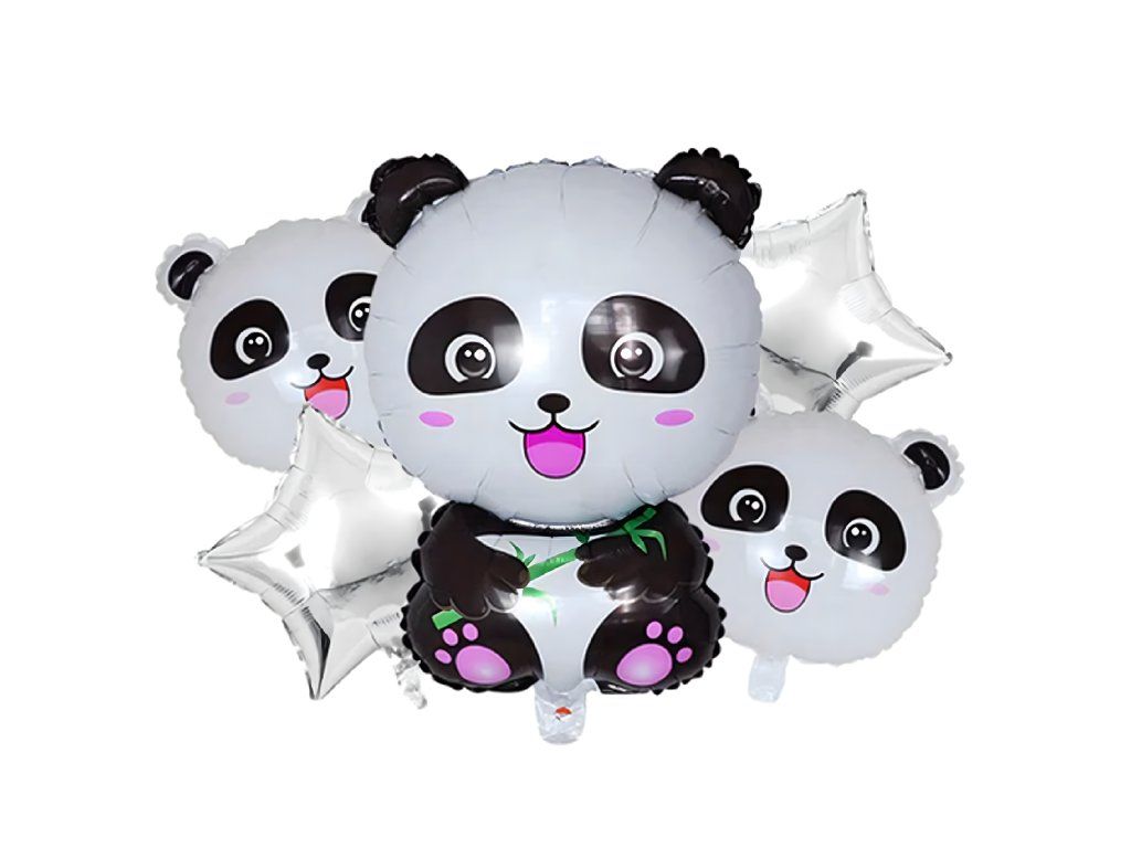 Kompletní sada 5 ks. - 1 balón panda, 2 kulaté pandy, 2 stříbrné hvězdičky.