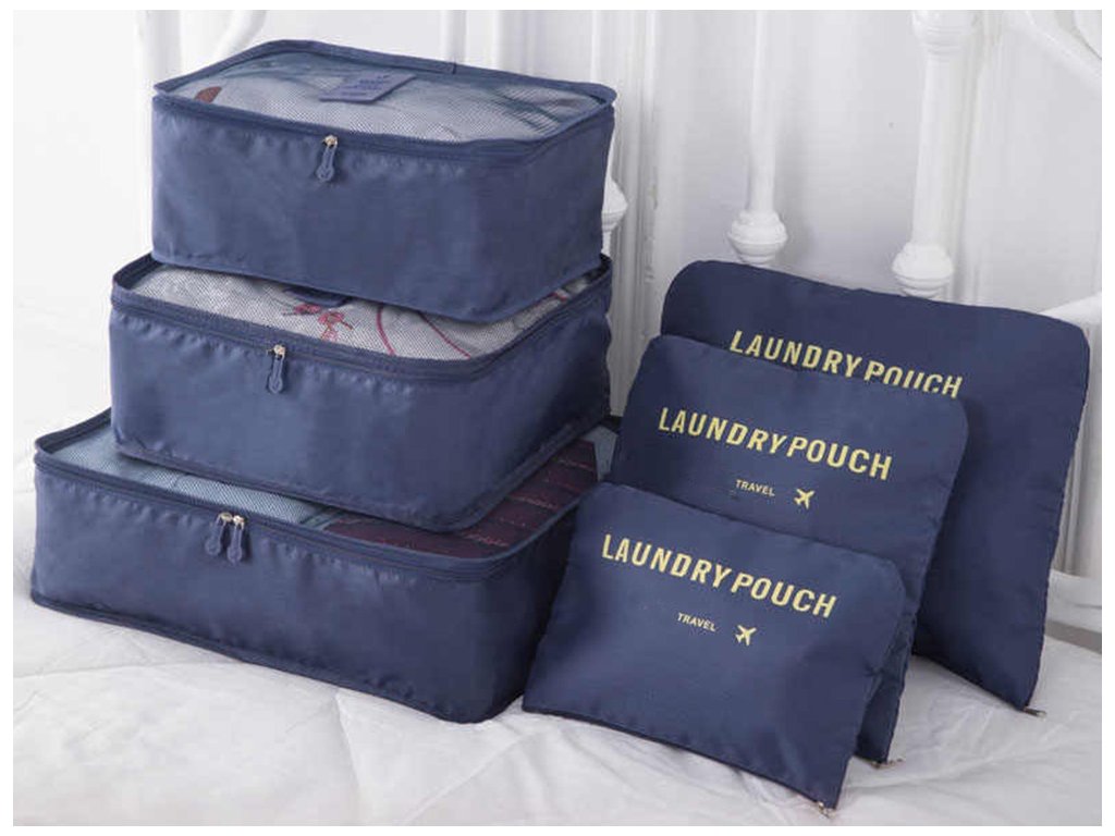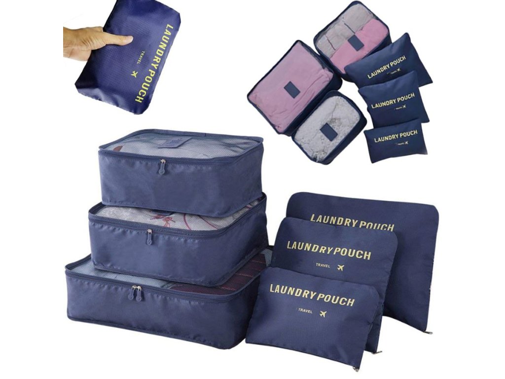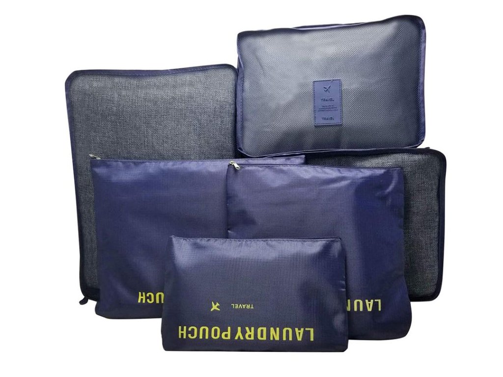 Sada šesti cestovních organizérů , ideální pro zabalení všech potřebných věcí, jako je spodní prádlo, boty, oblečení nebo kosmetika , a pro uložení prádla na vyprání.