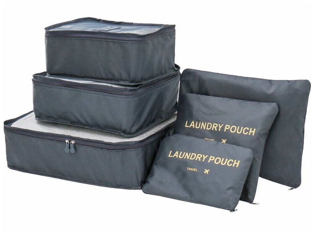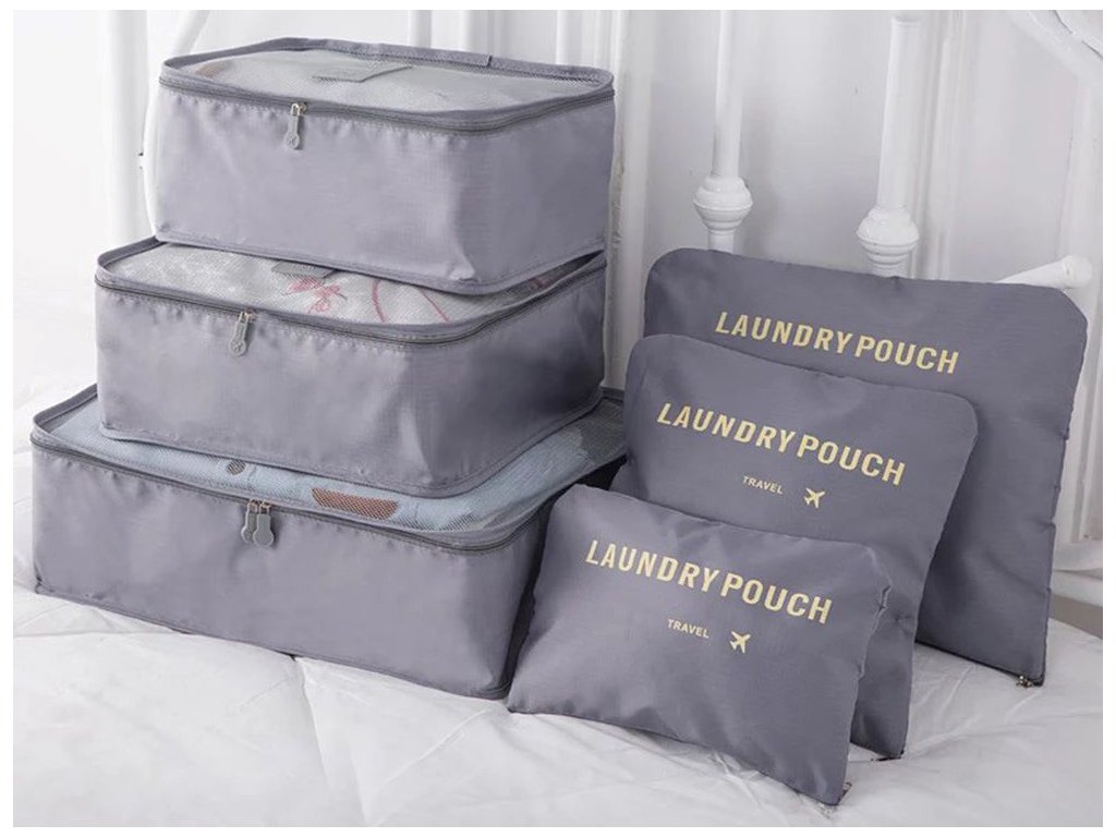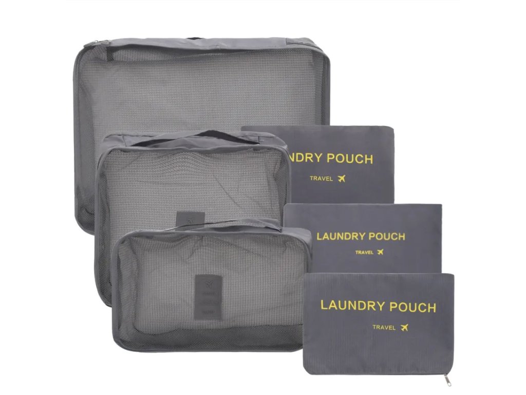 Sada šesti cestovních organizérů , ideální pro zabalení všech potřebných věcí, jako je spodní prádlo, boty, oblečení nebo kosmetika , a pro uložení prádla na vyprání.