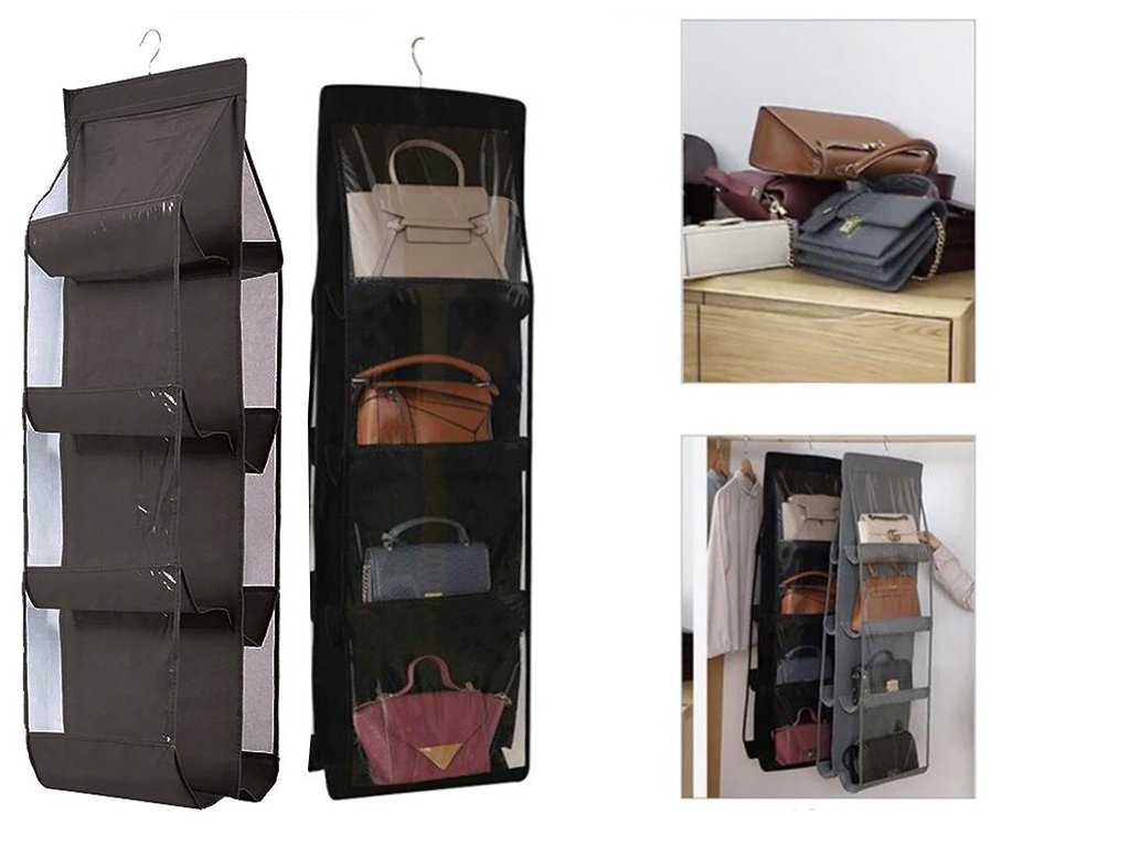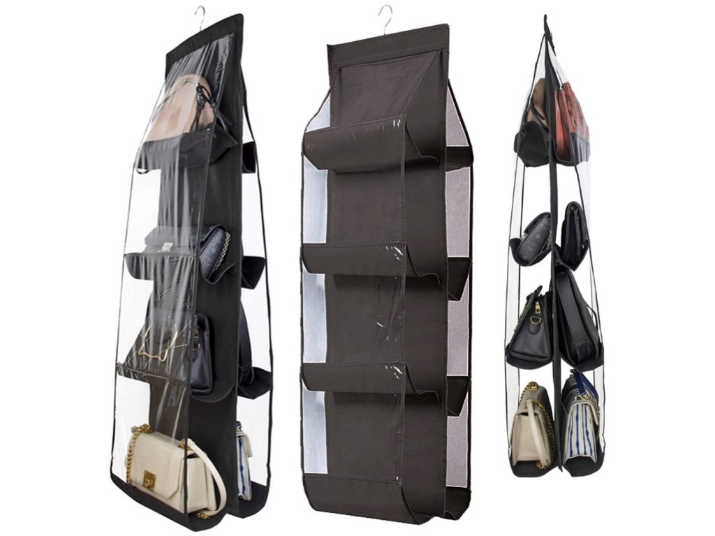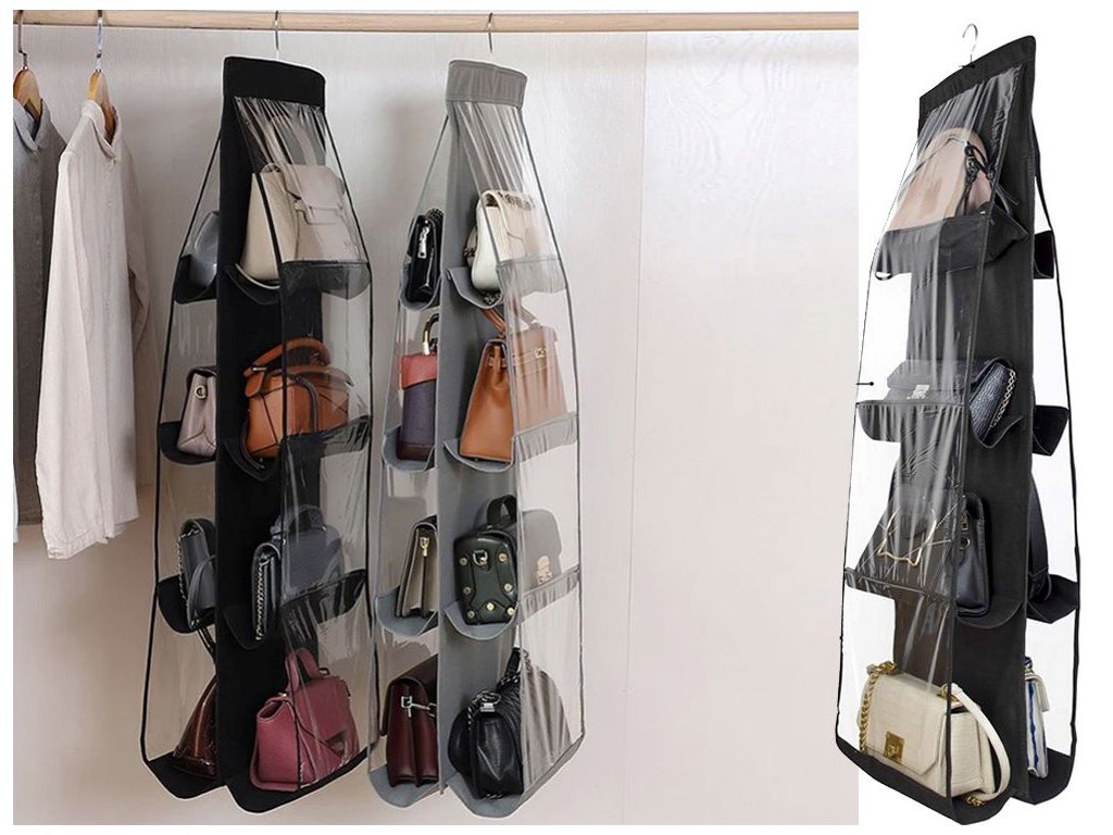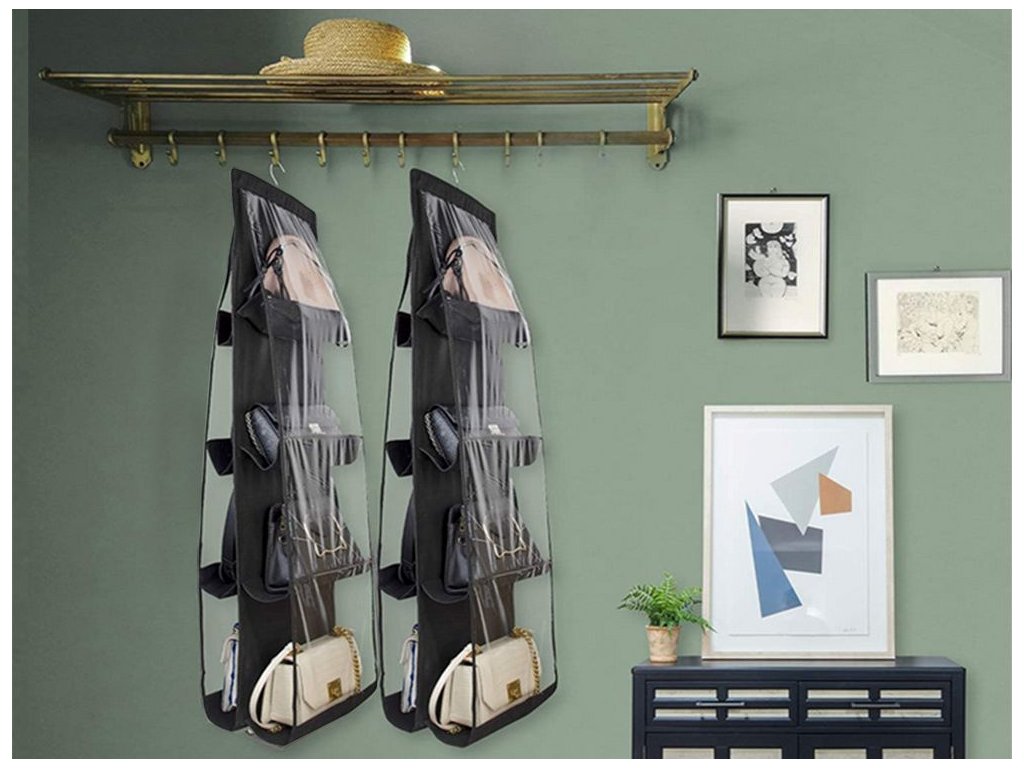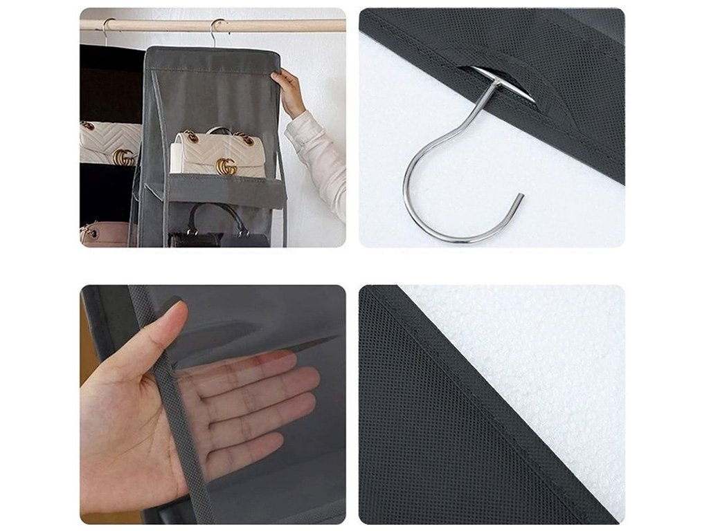 Organizér má 8 průhledných kapes , do kterých můžete uložit až 16 příručních tašek. Navíc je součástí i kovový věšák na zavěšení.