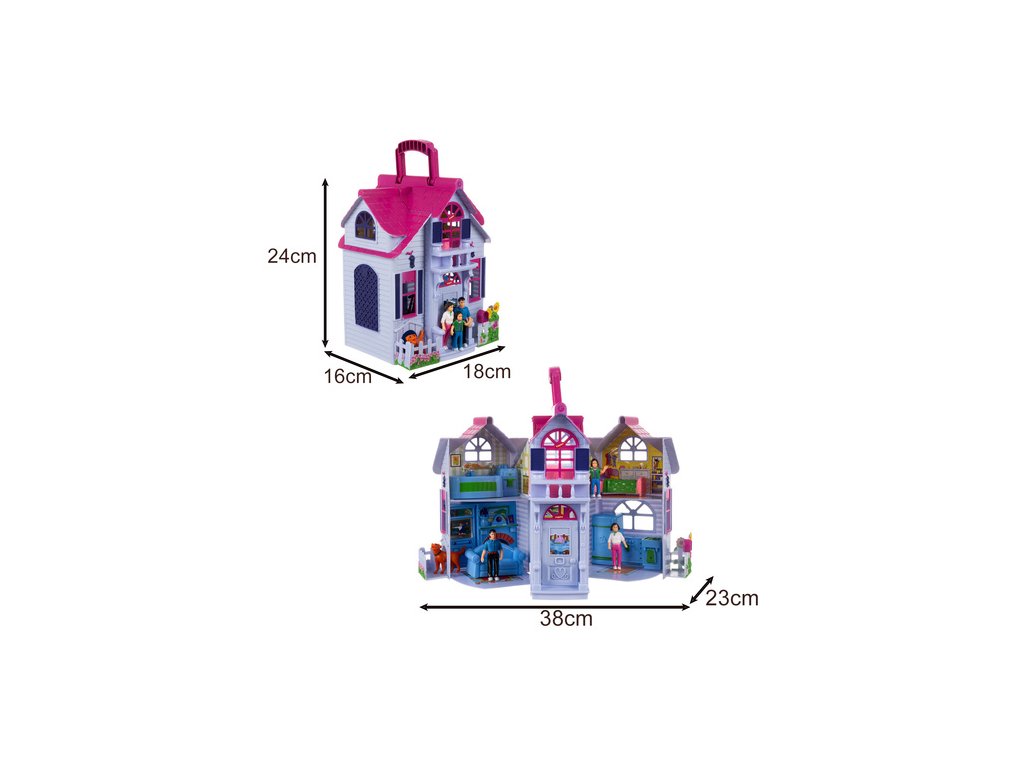 Barevný domeček pro panenky, který se rozkládá jako kufr a okamžitě vybízí ke hraní. Ideální pro malé fanoušky a nadšence do hraní rolí. Sada obsahuje rodinné figurky, psa a sadu nábytku, takže po otevření si můžete okamžitě vyzdobit interiér a vytvořit si vlastní příběhy. Odolný materiál a bezpečné hrany poskytují rodičům klid a dětem hodiny kreativního hraní.