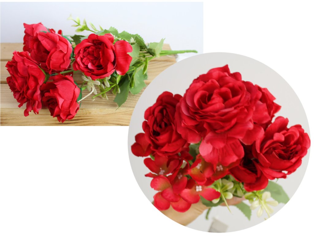 Smíšený buket RŮŽE, HORTENSIE výška 32 cm 7 stonků (5 květů 5-9 cm) ČERVENÁ