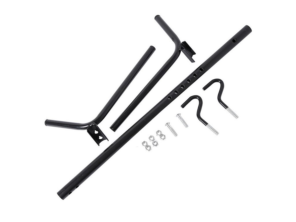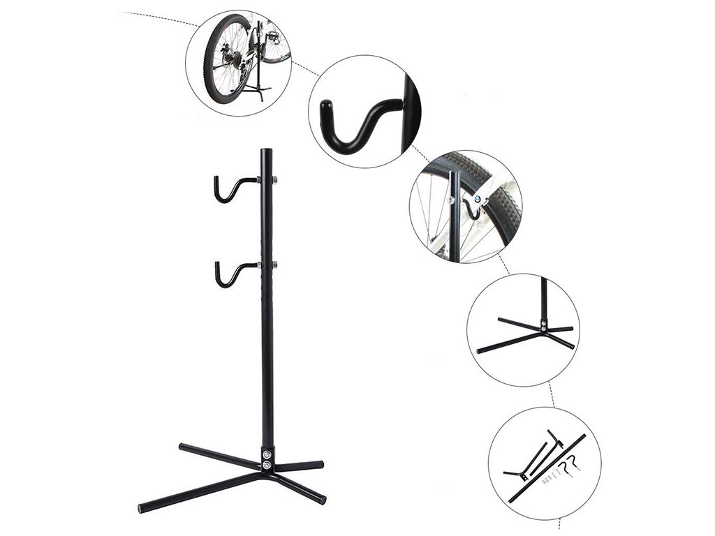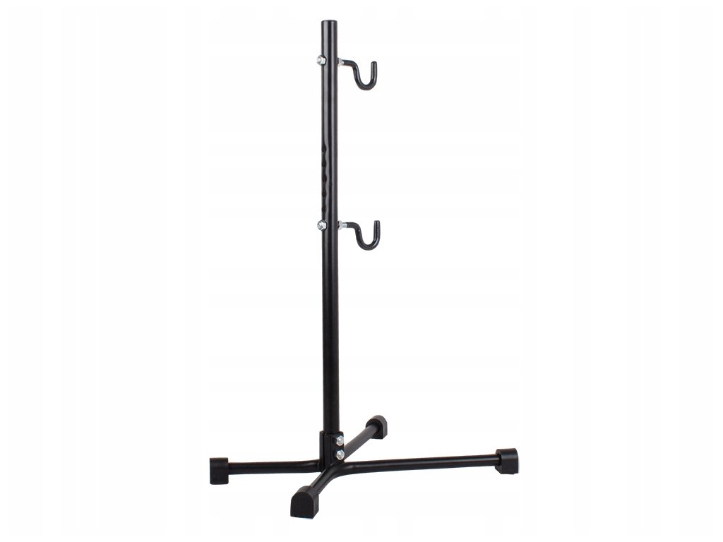 Háčky jsou pokryty gumovými podložkami , abychom si při servisních pracích nepoškrábali kolo . Díky předvrtaným otvorům můžeme nastavit výšku háčků . Stojan se snadno sestavuje a používá . Díky široce rozmístěným nohám na něm kolo bude stát stabilně.