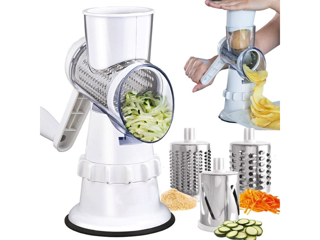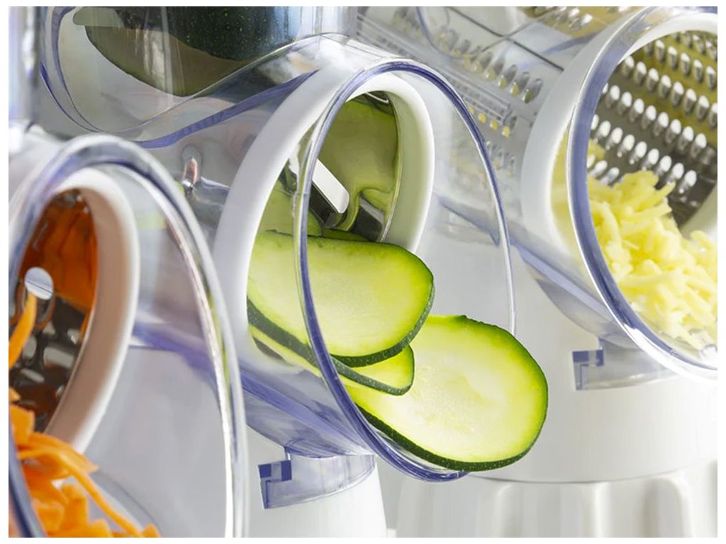 ✅ Buben s řezacími noži: nakrájí cuketu, mrkev, okurky na tenké plátky. Z takto připravených surovin připravíme např.: lahodné zeleninové chipsy.