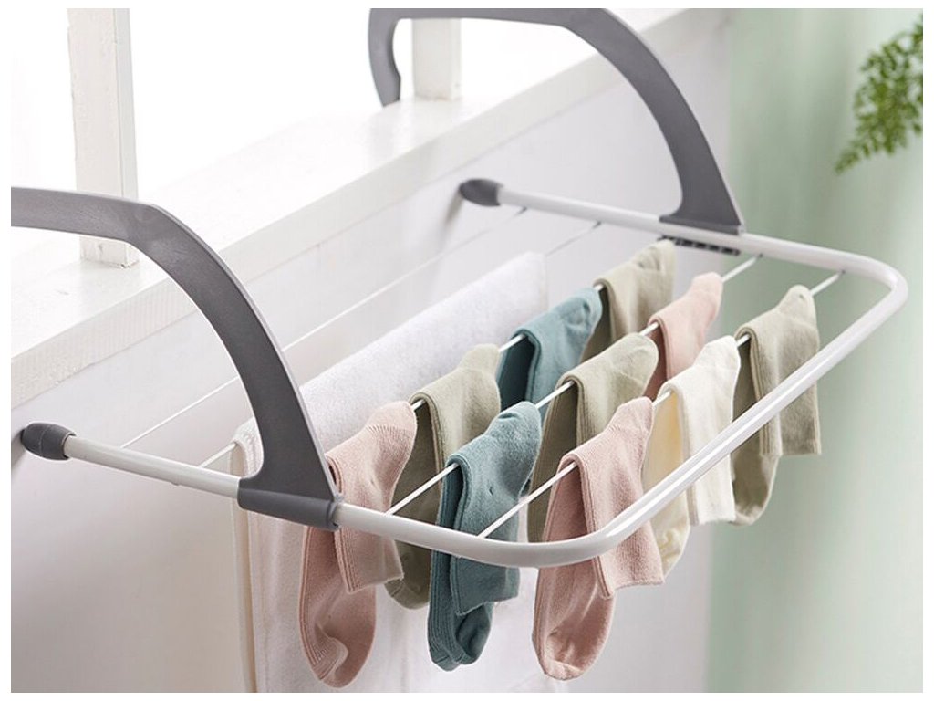 Sušička se díky svému designu snadno nasazuje i sundává. Po vysušení ji můžete schovat za pračku, skříň nebo pod postel. Zabere velmi málo místa, je lehká a snadno se skladuje .