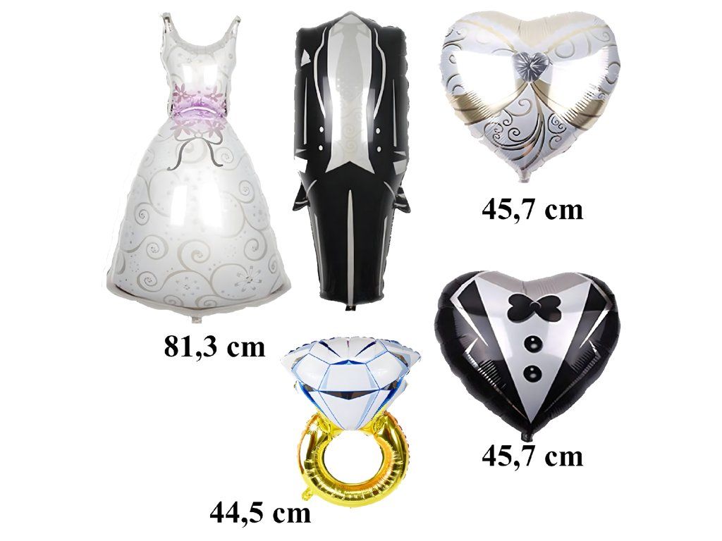 Kompletní sada 5 balónků – svatební šaty, oblek, 2 srdce a zásnubní prsten.