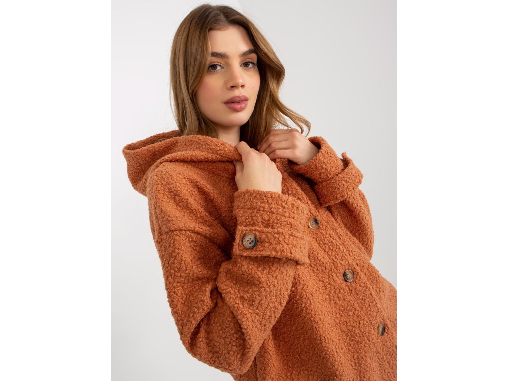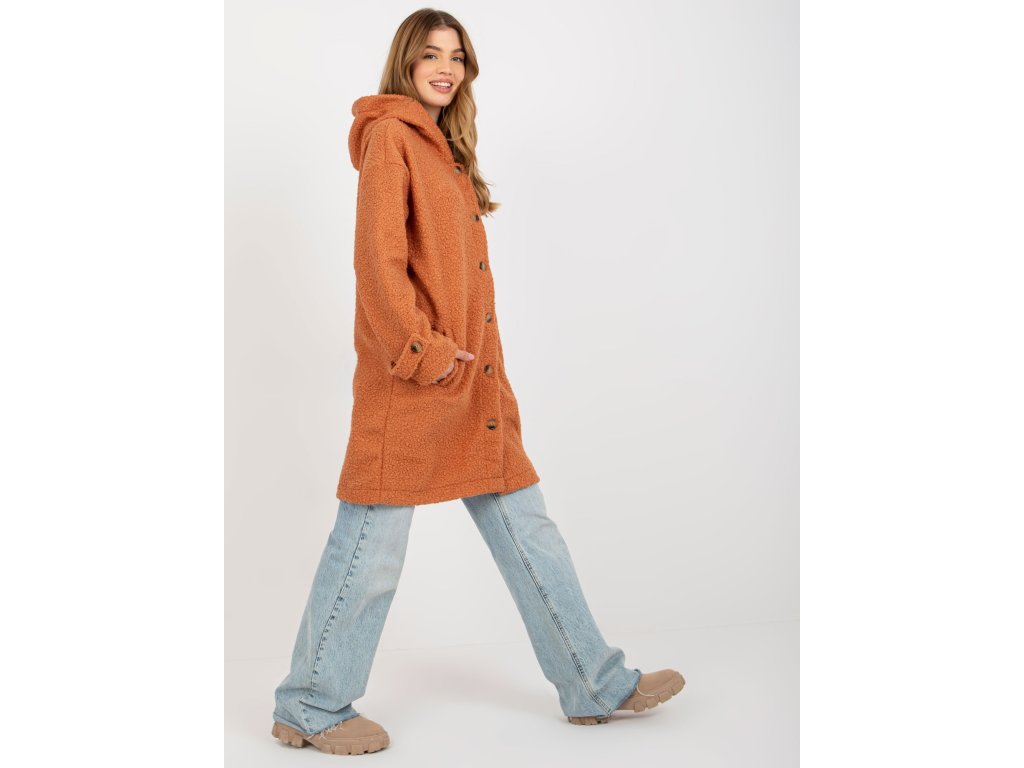 Tmavě oranžový plyšový dámský kabát s kapsami.
