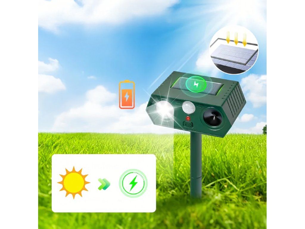 Tento solární ultrazvukový odpuzovač představuje účinnou, ekologickou a bezúdržbovou ochranu vašeho pozemku – 24 hodin denně, 7 dní v týdnu, bez chemikálií a bez ublížení zvířatům.