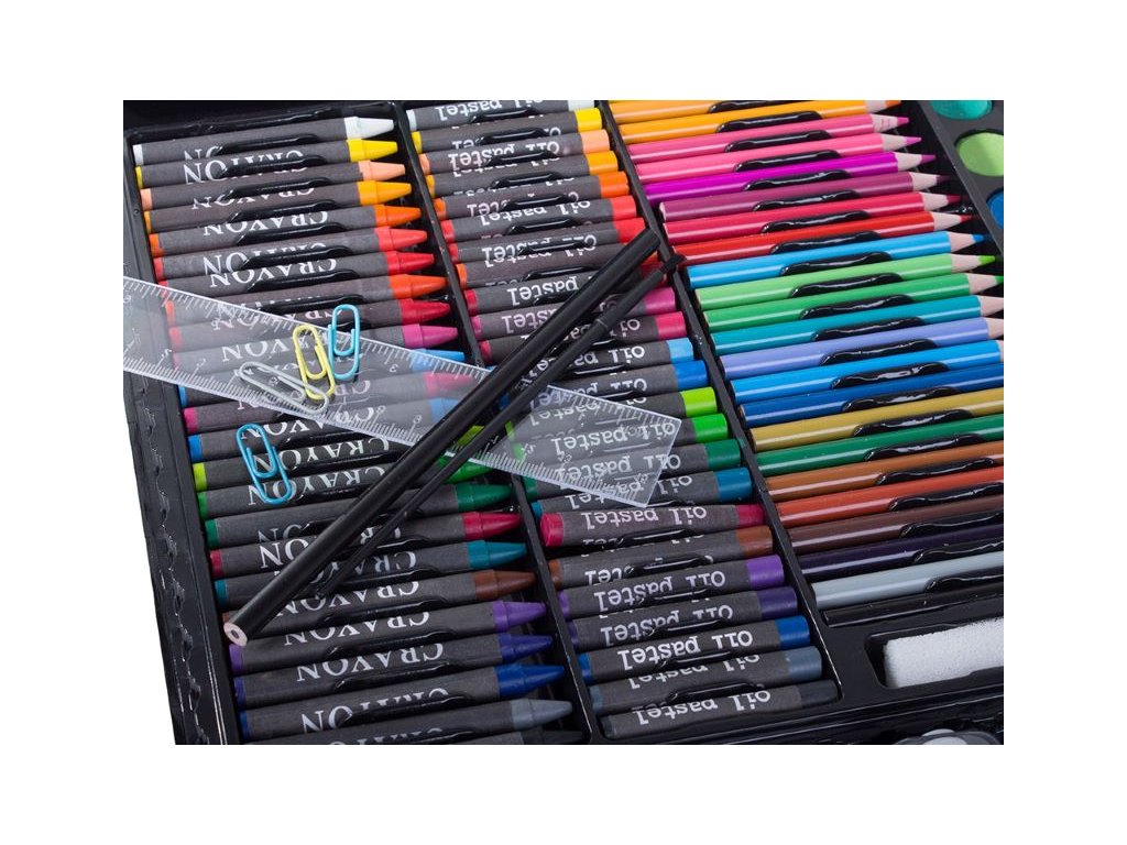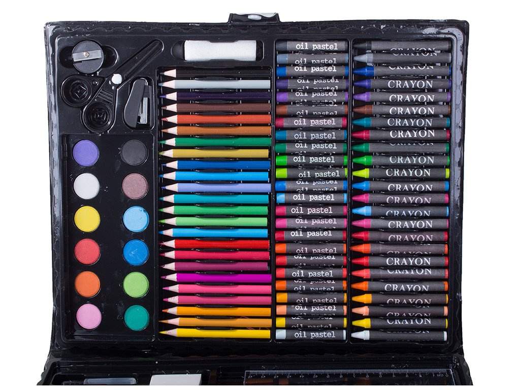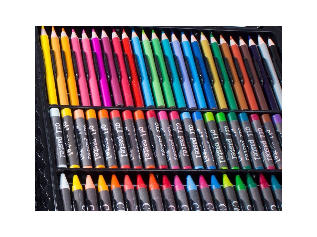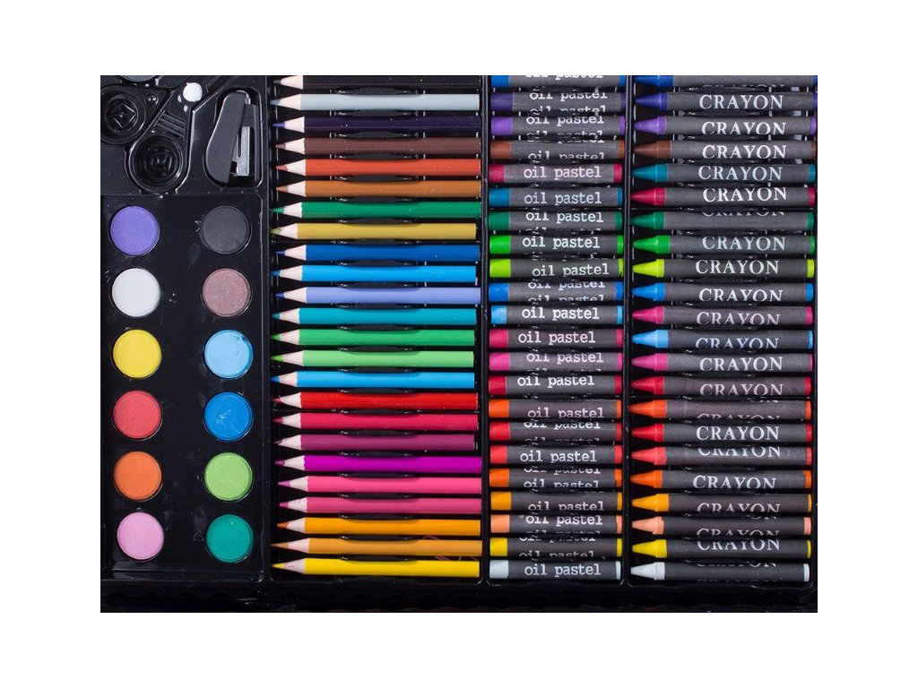 Pomocí obrovského výběru 24 pastelek, 24 fixů, 24 olejových pastelů, 24 svíčkových pastelů, 12 akvarelových barev, ořezávátka, lepidla, nůžek a gumy snadno vytvoříme ta nejnáročnější, nejkreativnější a originální díla