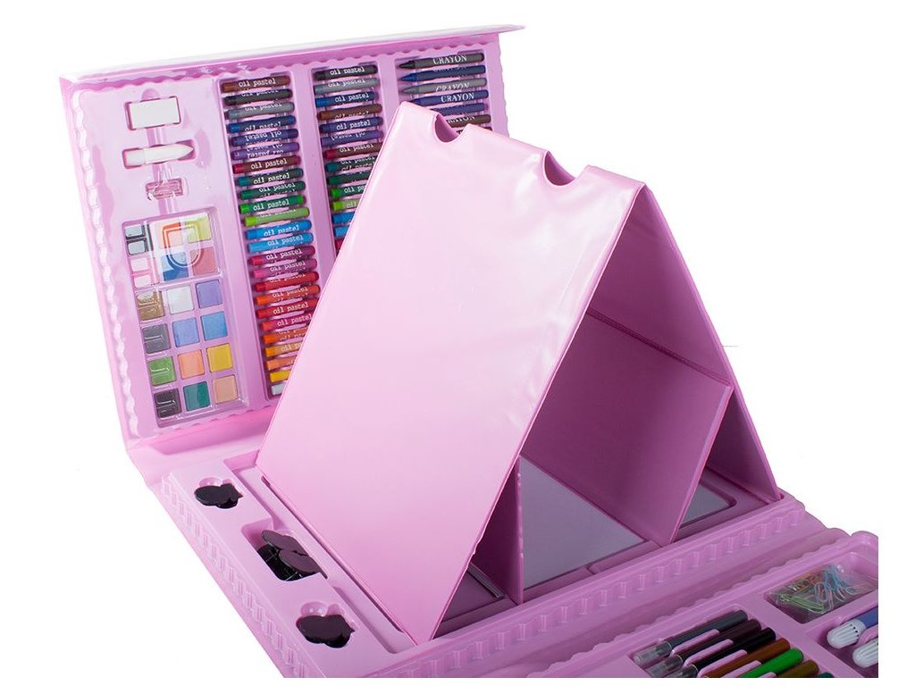 Vše je umístěno v kufru, takže veškeré příslušenství potřebné ke kreslení máme na jednom místě - vy ani vaše dítě nebudete muset hledat oblíbenou pastelku nebo barvu laku, kterou potřebují. Stojan uvnitř kufru usnadňuje kreslení. Sadu můžete snadno vzít na výlet nebo do školy.