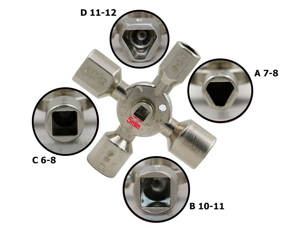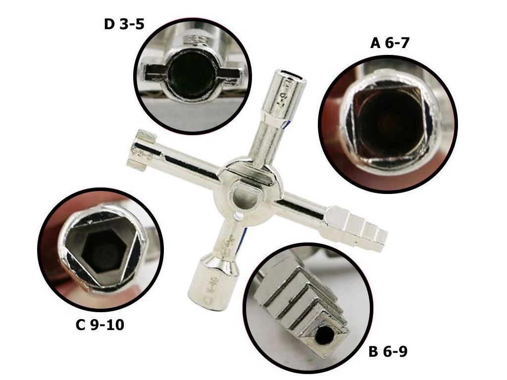 Univerzální klíč na plynové skříně, elektrické skříně, ovládací prvky, radiátory, okna, dveře a podobně.