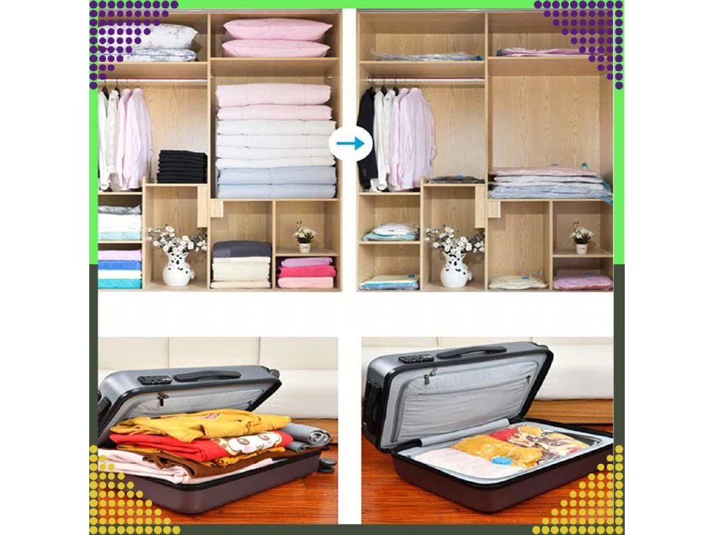 ⭐ Zmenšení objemu: Jednou z největších výhod vakuových sáčků je jejich schopnost zmenšit objem uložených věcí. Po vložení oblečení do sáčku, jeho uzavření a odsátí vzduchu vysavačem může celá hromada oblečení zmenšit svůj objem až čtyřikrát. To znamená, že místo skříní a polic přeplněných až po okraj máte nyní k dispozici více místa.