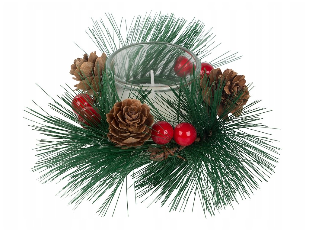 Mají elegantní, klasický vzhled, který dokonale zapadá do zimní atmosféry. Uprostřed každého svícnu je skleněná nádoba na malou svíčku obklopená umělými borovicovými větvičkami, šiškami a červeným ovocem. Borovicové větvičky a šišky dodávají svíčkám přirozené kouzlo.