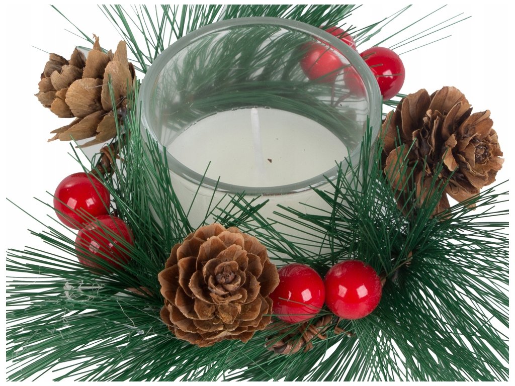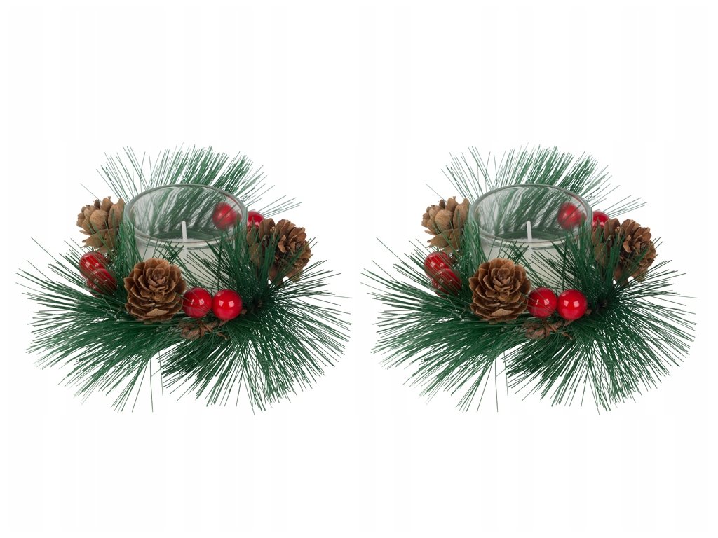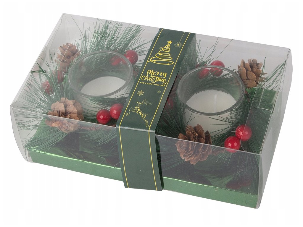 Vánoční svíčky v ozdobném věnečku – skleněný svícen se šiškami a bobulemi, 2 ks
